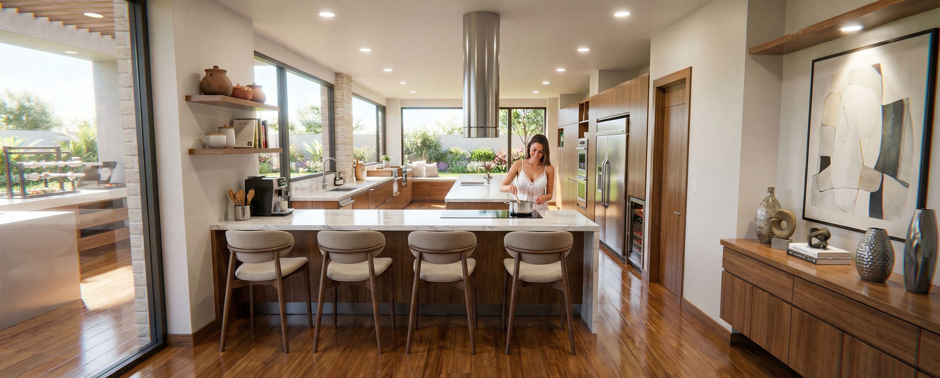 PISO EN MADERA BRILLANTE, MUEBLES EN MADERA SEMI BRILLANTE, SUPERFICIES DE LOS MEBLES DE LA COCINA EN MARMOL BLANCO, NEVERA Y TORRE DE HORNOS EN ACERO BRILLANTE, CUATRO SILLAS EN EL COMEDOR DIARIO. CAMPANA ESTRACTORA CILINDRICA EN ACERO INOXIDABLE SOBRE LA ESTUFA. MOSTRAR OBJETOS DE DECORACION DE COCINA, EN EL MUEBLE DE LA DERECHA UN CUADRO MODERNO CON SPOT DE LUZ Y OBJETOS DE DECORACION, MOSTRA UNA MUJER HERMOSA EN BABY DOLL COCINANDO, LUCES EMPOTRADAS LED DISTRIBUIDAS EN EL TECHO DE LA COCINA. EXTERIOR MOSTRANDO UN DIA SOLEADO, keep exact camera angle