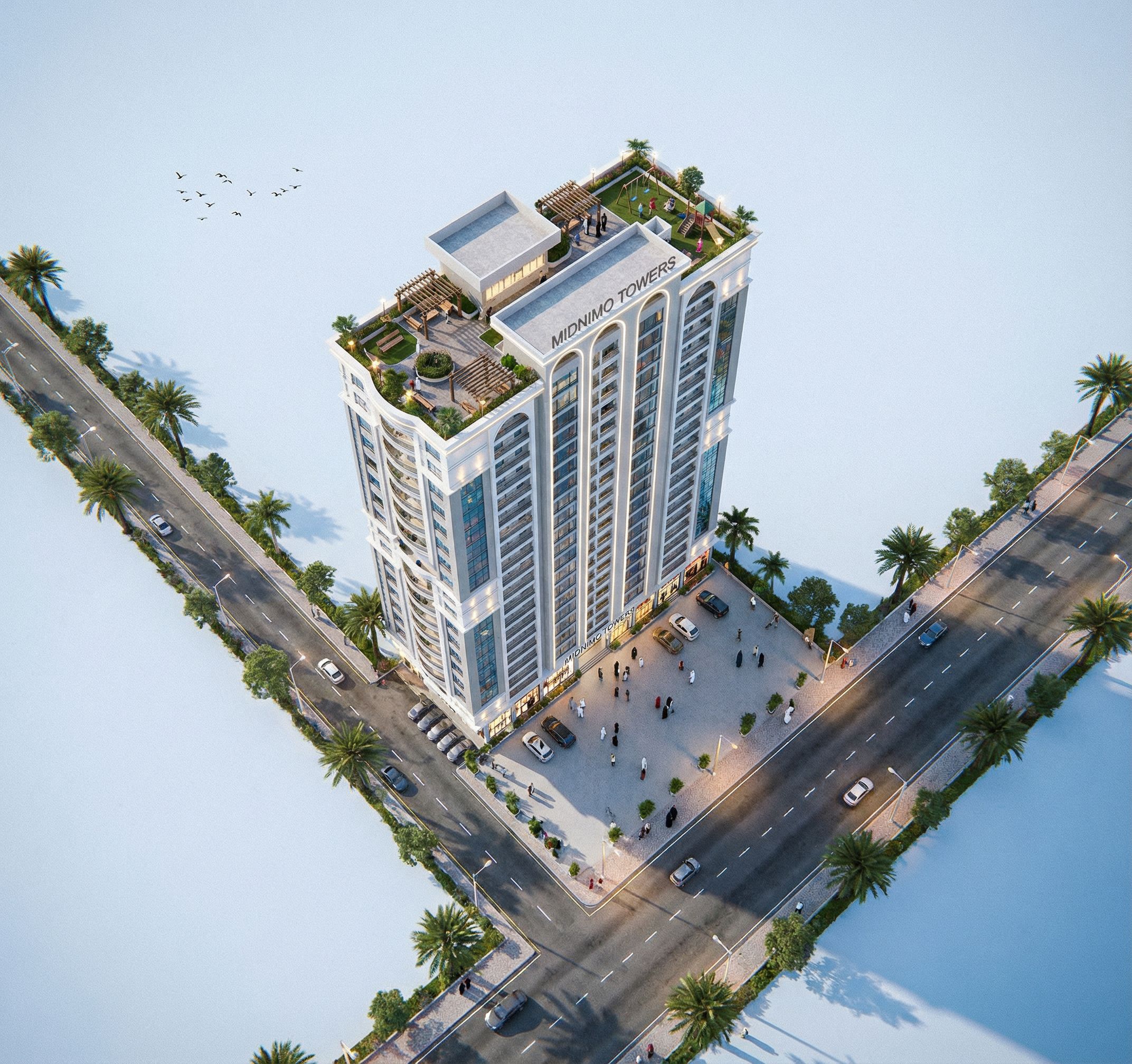 AERIAL IMAGE OF A BUILDING WITH GROUND FLOOR AND FIRST FLOOR AS COMMERCIAL FLOORS AND 2ND -20TH FLOORS APARTMENTS. MAKE THE GLASS REALISTIC, CLEAR AND REFLECTIVE. INCLUDE SOME SPOT LIGHTS AND ROPE LIGHTS, STREET LIGHTS IN THE BUILDING. INCLUDE SOME BIRDS IN THE SKY. INCLUDE SOME PEOPLE OF SOMALI ORIGIN IN THE IMAGE. USE WHITE AND PASTEL BROWN COLOUR ON THE BUILDING. PUT THE NAME " MIDNIMO TOWERS" ON THE BUILDING. INCLUDE MOULDINGS ON OPENINGS, WINDOWS AND ARCHES IN THE BUILDING. USE WHITE WALL MASTER AND PASTEL GREY ON THE BUILDING. REDUCE THE SIZE OF THE WRITING "MIDNIMO TOWERS" AND WRITE IT ALSO AT THE CURVED PART OF THE ROOF ON THE BUILDING FACADE. REPLACE THE BROWN WITH A LIGHTER PASTEL GREY COLOUR. INCLUDE SOME SITTING AREA AND CHILDREN'S PLAYING AREA ON THE ROOF., keep exact camera angle