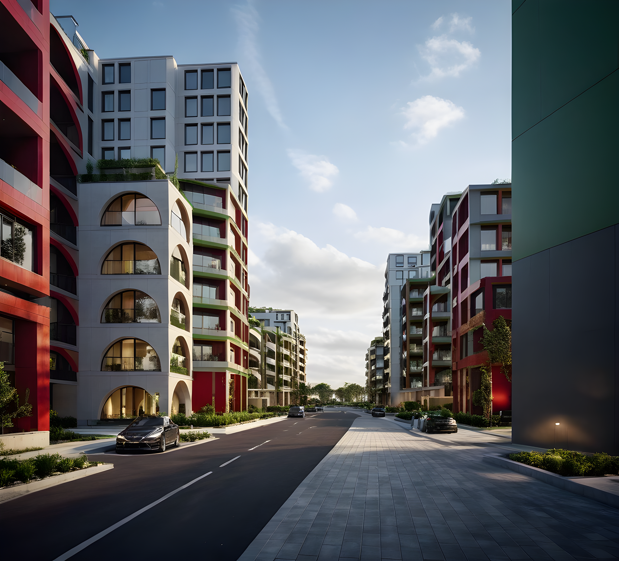 PromptLUXURY ARCHITECTURE. LUXURY APARTMENTS, DAY LIGHT, STREET, RED COLOR, GREY COLOR, YELLOW COLOR, GREEN COLOR, GREEN ROOF TOP