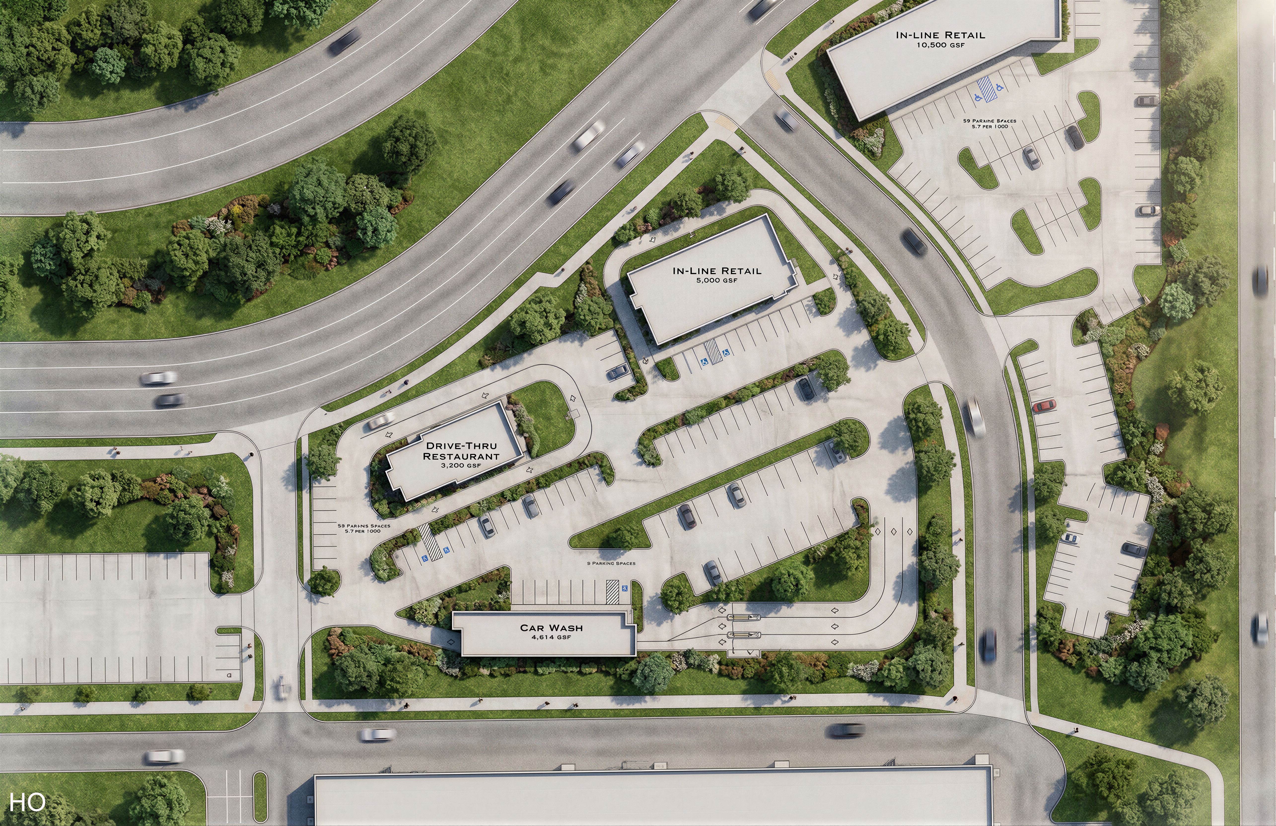 EnhancedPromptCreate a high-quality, photorealistic architectural rendering of the provided site plan / master plan. IMPORTANT: Do NOT modify, redesign, reinterpret, or move any elements of the plan. Maintain the exact layout, geometry, building footprints, parking layout, drive aisles, sidewalks, landscape areas, and dimensions exactly as shown in the drawing. The rendering must strictly follow the original plan. Rendering requirements: • Convert the plan into a clean, high-resolution, colored architectural site plan rendering. • Maintain the exact scale and proportions of all elements. • Apply realistic materials and textures to buildings, pavement, sidewalks, grass, trees, and landscape areas. • Use natural color palette and realistic shading. • Add subtle realistic landscape elements such as trees, grass, shrubs, and ground cover only where landscaping is already indicated on the plan. -NO WATER OR PONDS -MAKE ROOFS FLAT • Render parking areas, roads, and walkways with realistic paving textures. • Add soft shadows and lighting for depth while keeping the drawing readable. • Keep all labels, markings, and layout legible if present. • Produce a professional architectural presentation style suitable for client presentation. Output: Ultra-high resolution, crisp, professional, realistic architectural site plan rendering with clean graphics and natural colors, without altering any part of the original design.