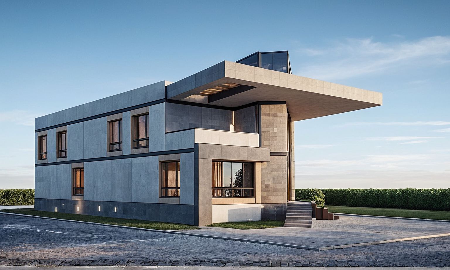 PromptPhoto of a modern residential building featuring a two-story structure with a flat roof. Architectural details include a textured stone facade, large glass windows, and a wooden door, surrounded by a minimalistic landscape. Urban setting with a geometric driveway leading to the entrance. Natural daylight highlighting the building's materials, creating soft shadows. Captured from a low angle to emphasize height, using a wide lens for a comprehensive view, showcasing both the building and its immediate environment.