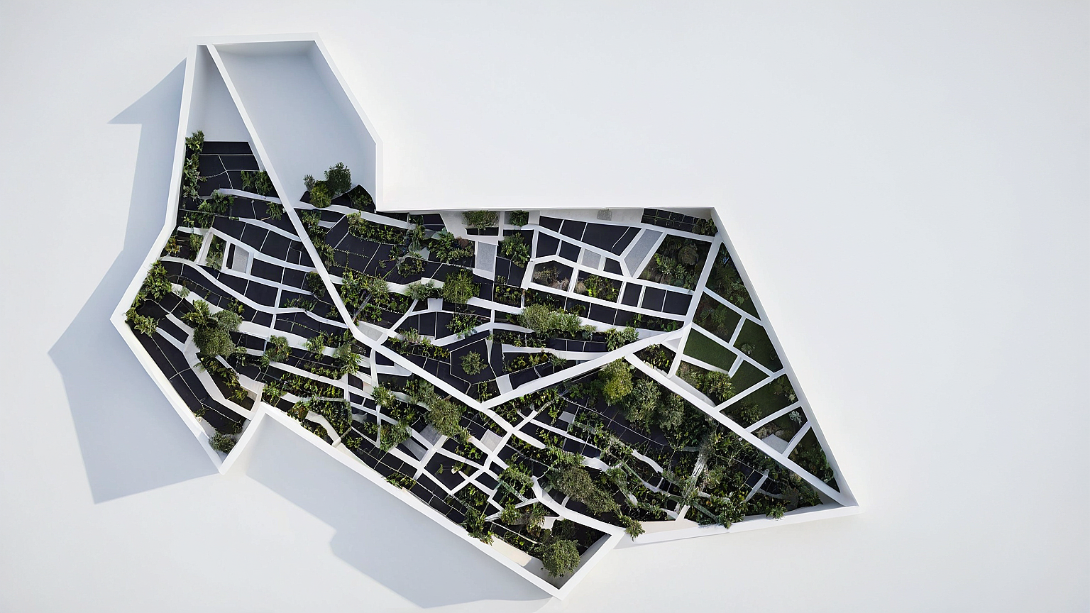 Genera cubiertas de edificios, guiándote por las geometrías negras en la imagen, en los interiores blancos genera patios verdes
