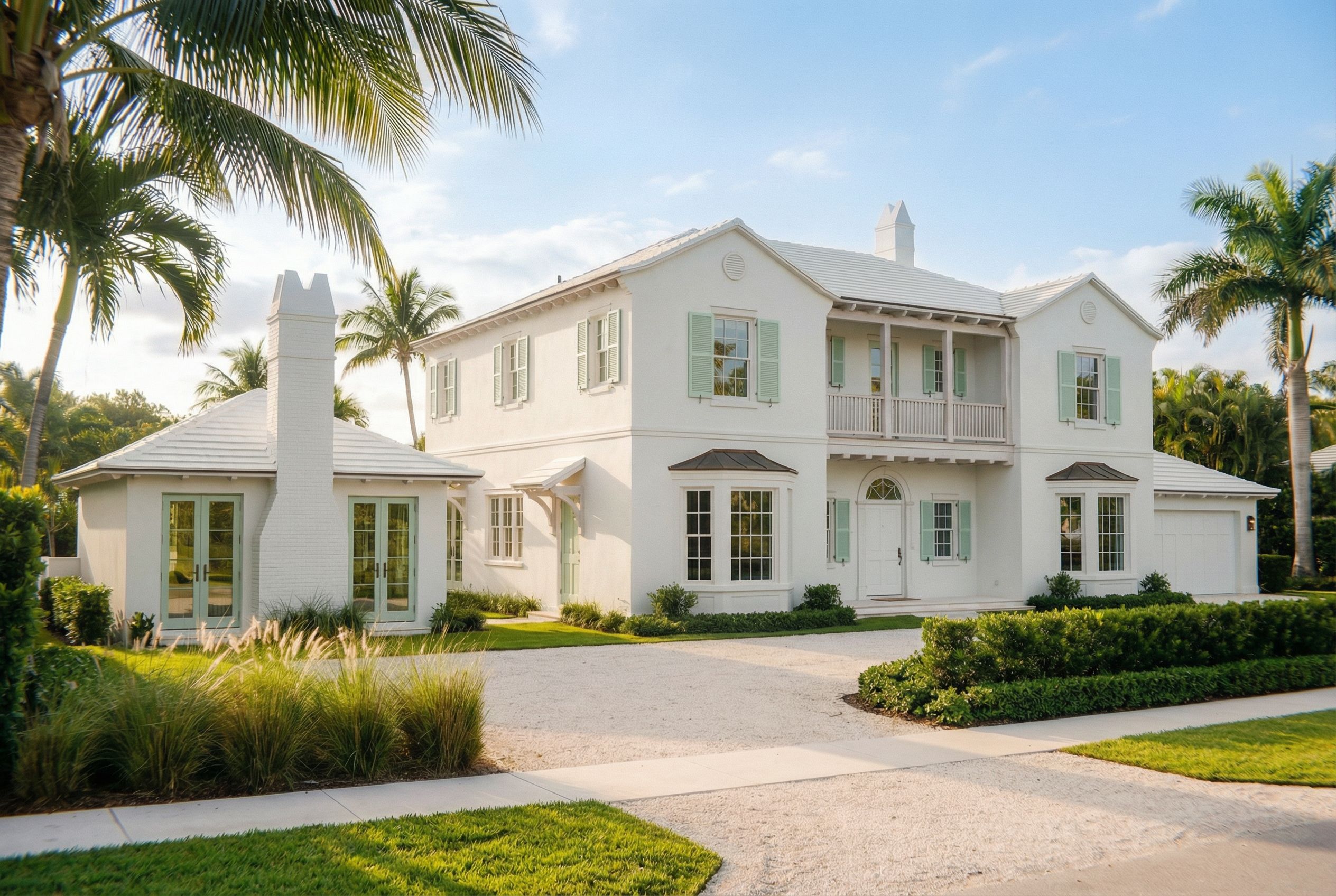 Ultra-photorealistic architectural exterior rendering created directly from the provided front elevation drawing. The elevation must be treated as the strict architectural blueprint. All proportions, roof heights, window spacing, façade alignment, and architectural linework must match the elevation exactly with no modifications. Architecture style: refined Monterey Colonial residence with elegant coastal Palm Beach character. Site composition and depth: The composition contains a main house and a detached cabana. The cabana sits approximately 25 feet from the front property line while the main house sits approximately 30 feet from the front property line. The cabana should therefore appear only slightly forward of the main house. The depth difference should remain subtle and not exaggerated in perspective. Cabana façade layout: The cabana contains a centered stucco chimney. On each side of the chimney there is a full-height glass door. The doors are symmetrical and positioned evenly on both sides of the chimney exactly as shown in the elevation. The doors are painted white and must not be replaced with windows or merged into a single centered opening. Materials: Exterior walls: smooth white stucco with refined plaster texture and crisp architectural shadow lines Window surrounds, headers, and sills: white stucco matching the walls Columns, balcony railings, rafters, and exposed wood elements: whitewashed pecky cypress with a smooth matte finish and extremely subtle grain that is barely visible Roof: white concrete tile roof with realistic tile depth and matte finish Bay window roofs: natural copper roofs with soft realistic patina tones, muted and complementary, not shiny or reflective Shutters: Benjamin Moore Fresh Dew soft pale mint green Front door: painted white Garage door: painted white Chimneys: stucco chimneys matching the main walls Architectural character: Classic Monterey style second-floor balcony with wood posts and railings Refined colonial proportions Clean symmetrical façade composition matching the elevation Lighting: Bright **mid-afternoon daylight approximately 3 PM** with clear sky conditions. Sun positioned generally behind and slightly to the side of the camera so the **entire front façade and the secondary visible side of the building are both well illuminated**. Soft daylight evenly lighting both visible building faces with minimal harsh shadows. Natural ambient sky light and reflected light brightening shaded areas so the architecture reads clearly on both faces. Environment: Palm Beach coastal landscaping with palms and ornamental grasses Light shell stone or limestone driveway and walkway Bright blue coastal sky with soft natural clouds Camera and composition: Cinematic architectural money-shot perspective Three-quarter perspective showing the depth of the architecture while keeping the front façade dominant Camera slightly offset from center 35mm architectural lens for natural perspective without distortion Eye-level architectural photography viewpoint Rendering style: Ultra photorealistic architectural visualization Luxury architectural photography quality Highly detailed materials and global illumination High dynamic range lighting 8k detail Critical constraints: Maintain the exact geometry and proportions of the provided elevation Do not modify façade layout or massing Do not change windows into doors or doors into windows Do not move the cabana dramatically forward Do not add gutters or downspouts Treat the elevation drawing as the strict blueprint for all architectural geometry Soft architectural daylight evenly illuminating both visible building faces. , keep exact camera angle
