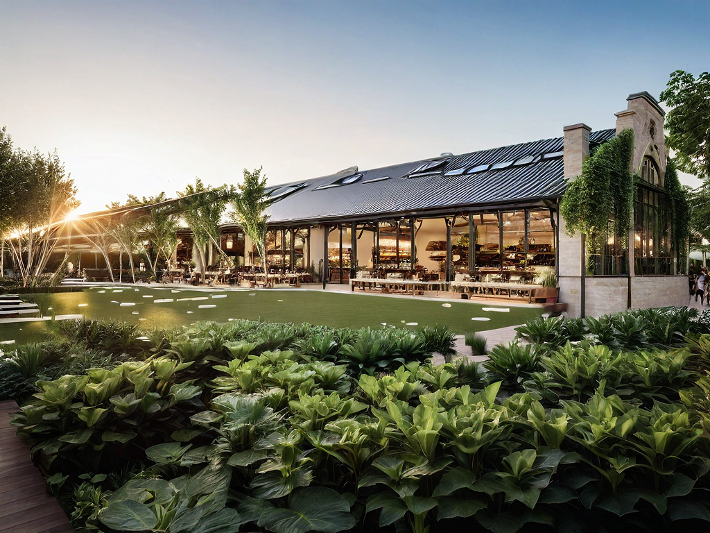 Promptfood hall, amazing garden, same construction materials, same facade style, amazing terrace, sunrise