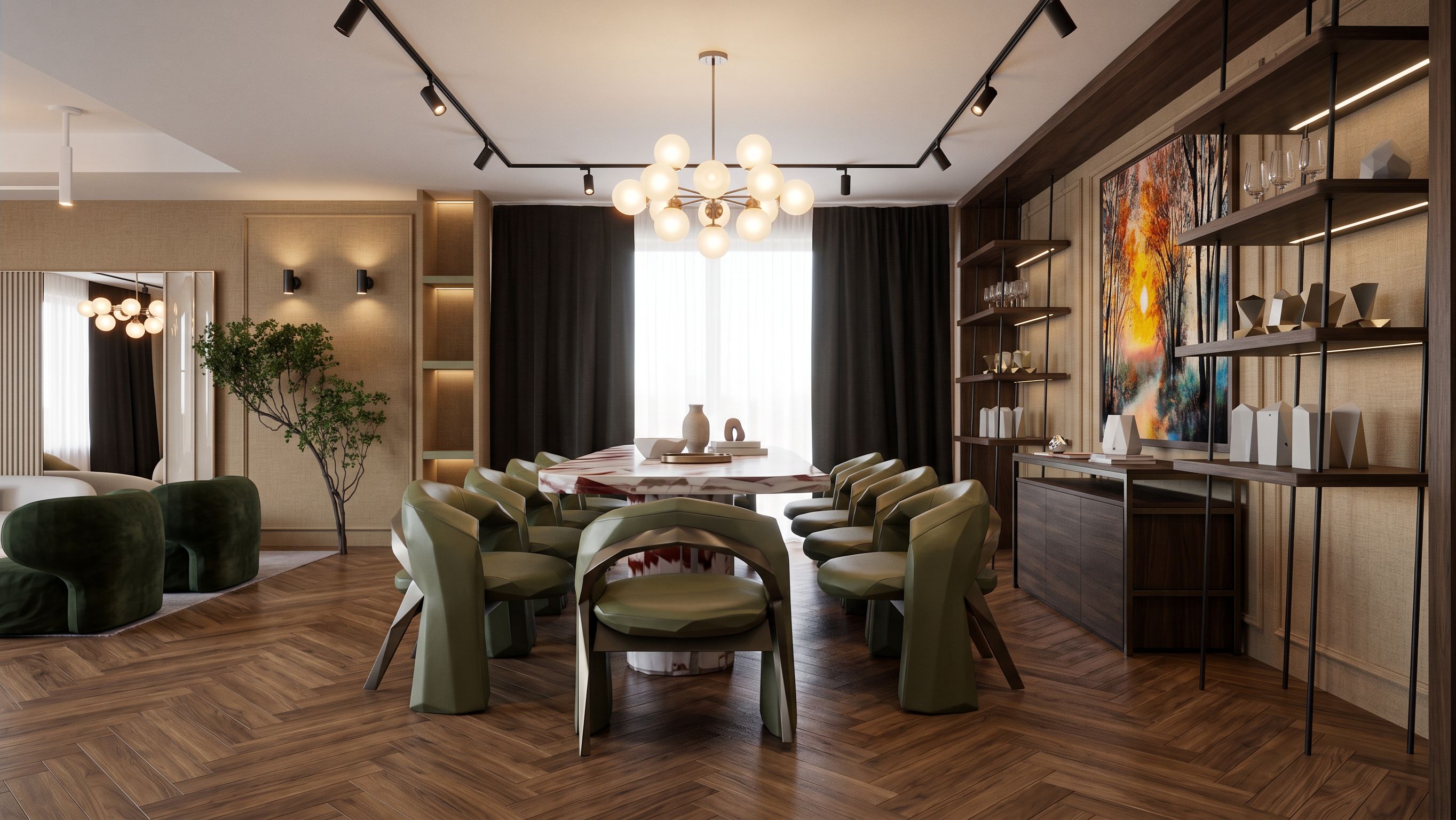 Ultra-realistic modern dining room, soft contemporary luxury style, warm neutral palette with earthy accents. Dining table with thick slab top in polished white marble featuring strong red/burgundy veining, slightly rounded edges, supported by sculptural marble legs. Dining chairs with curved backrests, upholstered in smooth olive green leather, matte finish, with dark bronze/brushed metal frames. Floor finished in natural wood parquet in herringbone pattern, medium walnut tone with subtle matte reflection. Back wall with textured fabric or micro-textured wallpaper in warm beige tone, framed with minimal wall moldings. Floating shelves in dark stained wood with slim black metal supports, styled with glassware, ceramic vases, and minimal decorative objects. Large central mirror with thin metallic frame reflecting the chandelier and adding depth to the space. Lighting: Statement chandelier with multiple frosted glass globe bulbs, warm 2700K–3000K, soft diffused glow. Ceiling track lights in matte black with adjustable spotlights, subtle accent lighting. Natural daylight entering from large window with sheer white curtains, soft and diffused, balanced exposure. Soft indirect ambient lighting, no harsh shadows, realistic light falloff. 🪴 DECOR & REALISM DETAILS very important Dining table styling: Minimal centerpiece with ceramic vase, small sculptural object, stacked books, and tray. Add subtle imperfections: fingerprints on marble gloss, micro scratches, fabric creases on chairs. Shelves styling: Mix of transparent glassware, matte ceramics, and metallic accents. Add slight randomness not perfectly aligned. Extra realism: Soft shadows under chairs and table Accurate reflections in mirror and marble Ambient occlusion in corners Slight dust and natural variation in materials 🎥 CAMERA & RENDER SETTINGS Eye-level shot, centered composition Lens: 35mm for natural perspective Photorealistic, global illumination, ray tracing High dynamic range, soft contrast 8K resolution, ultra-detailed textures. “same materials, same lighting setup, same scene, different camera angles only” side angle from chair level close-up on marble table perspective focusing on shelves shot through foreground cinematic depth, keep exact camera angle