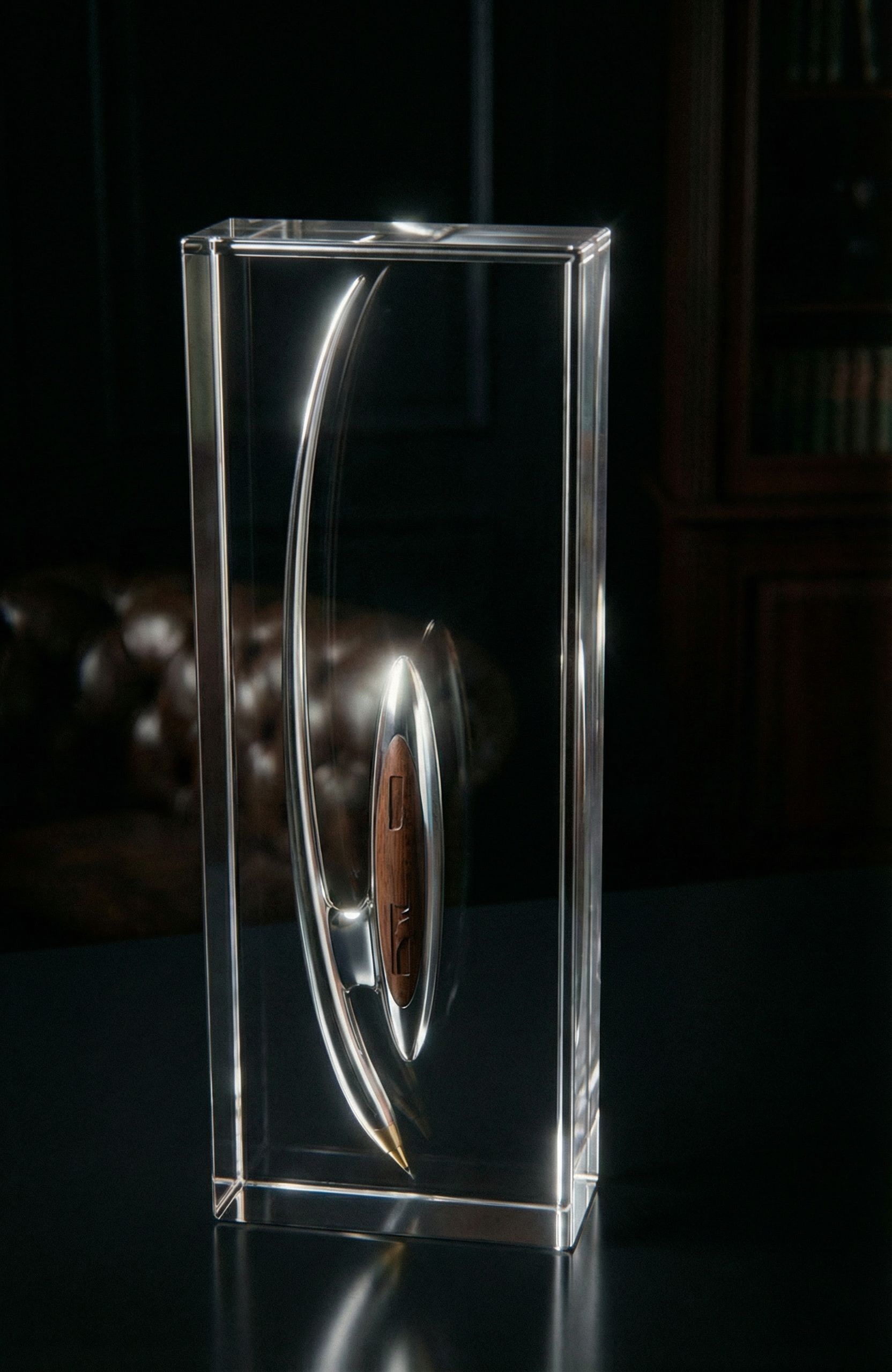 PromptCREATE A REALISTIC IMAGE OF THIS PICTURE; the frame shown is polished plexyglass; the pen shown inside is chrome-plated metal; the pen tip is brass. The background is dark, the object is resting on a black background; behind the background is black, and the lighting is focused on the object, with soft lighting all around., keep exact camera angle, keep exact camera angle
