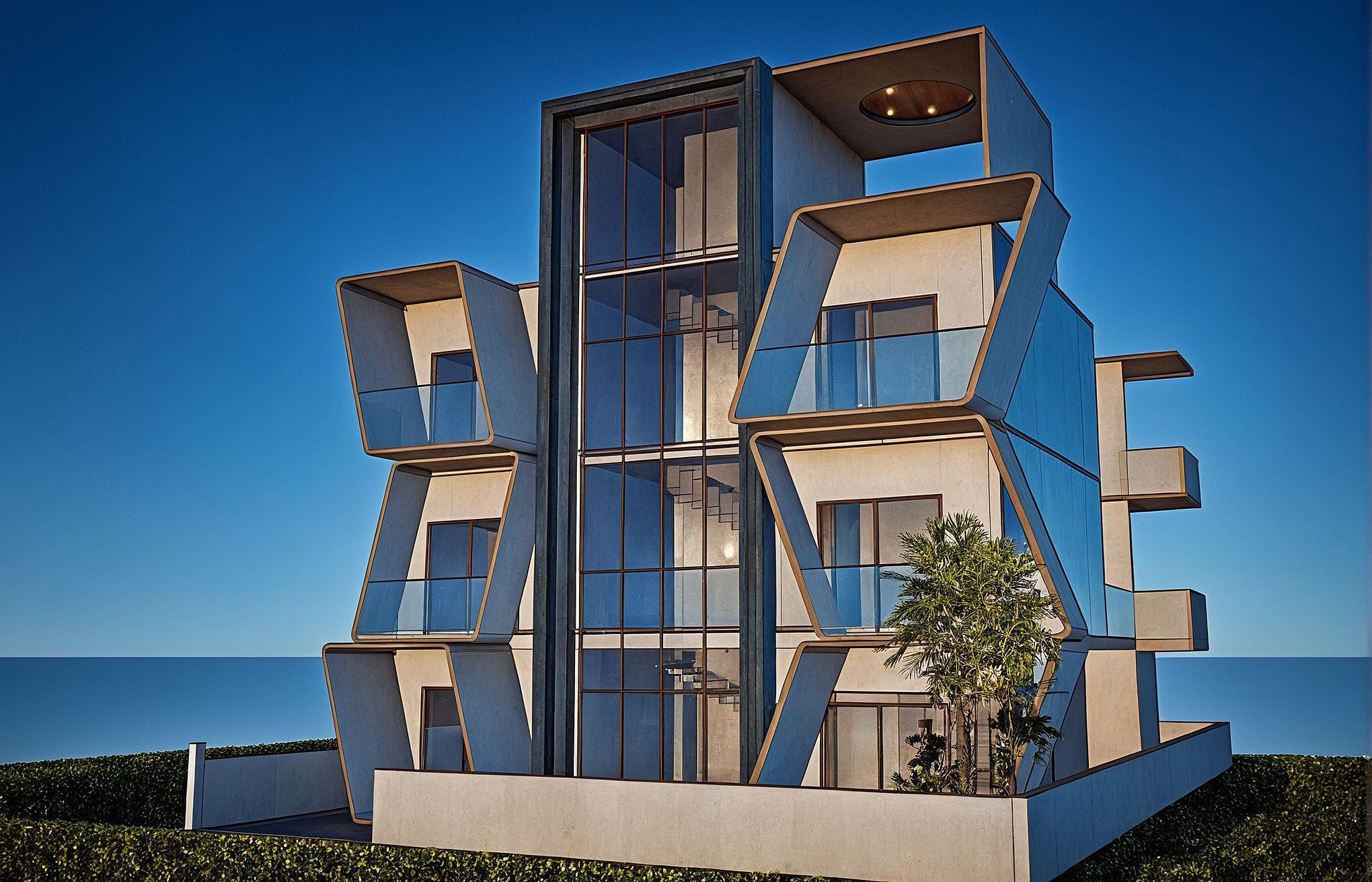 Photo of a contemporary residential building featuring dynamic angular balconies and large glass panels. Architectural elements include a mix of concrete and wood materials, complemented by lush greenery at the base. Set against a clear blue sky, the scene captures midday sunlight creating sharp shadows and reflections on the glass. Framed from a low-angle perspective, highlighting the unique silhouette and intricate details of the façade, evoking a sense of modern sophistication and inviting openness.