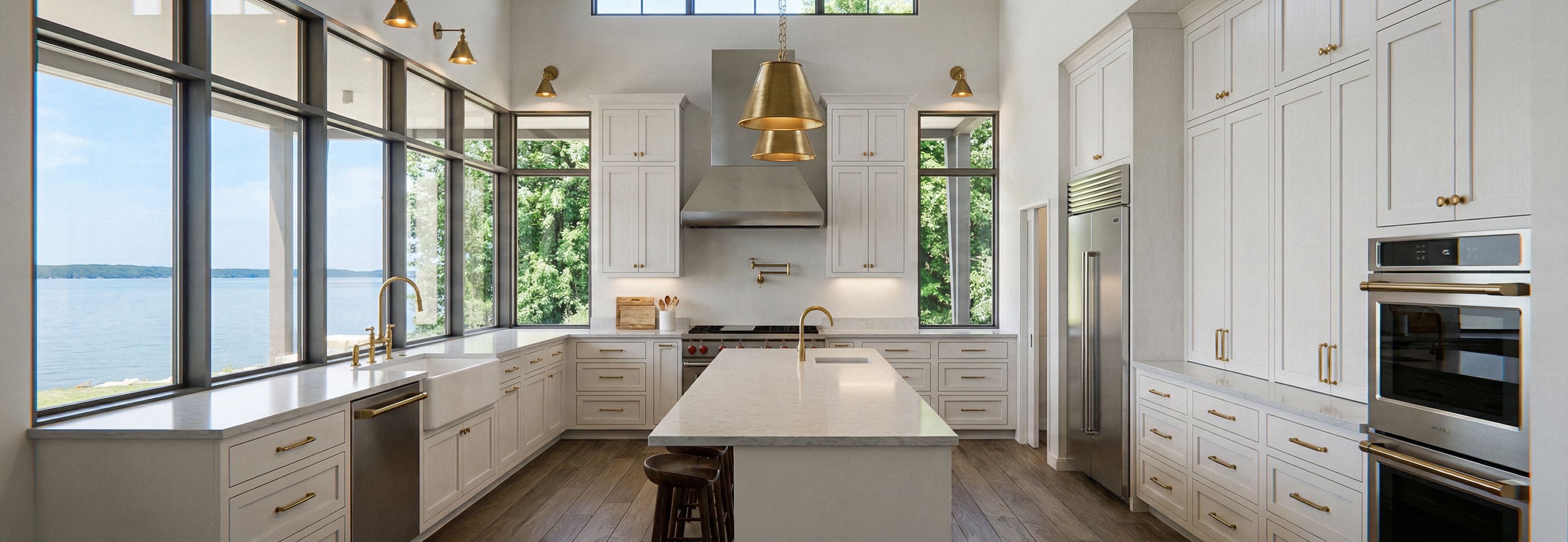Make photorealistic rendering of farmhouse style kitchen per Uploaded Image, white wood cabinets throughout, brass cabinet hardware, steel hood above the range, wall cabinets flanking the hood, base cabinets where the countertop slabs are, Fill Refrigerator Wall with wall cabinets, dishwasher next to farmhouse sink, add lighting fixtures where appropriate, Lake view per Reference Image 1 from the windows on the left, trees view from the middle and right windows, keep camera angle exactly the same, keep exact camera angle
