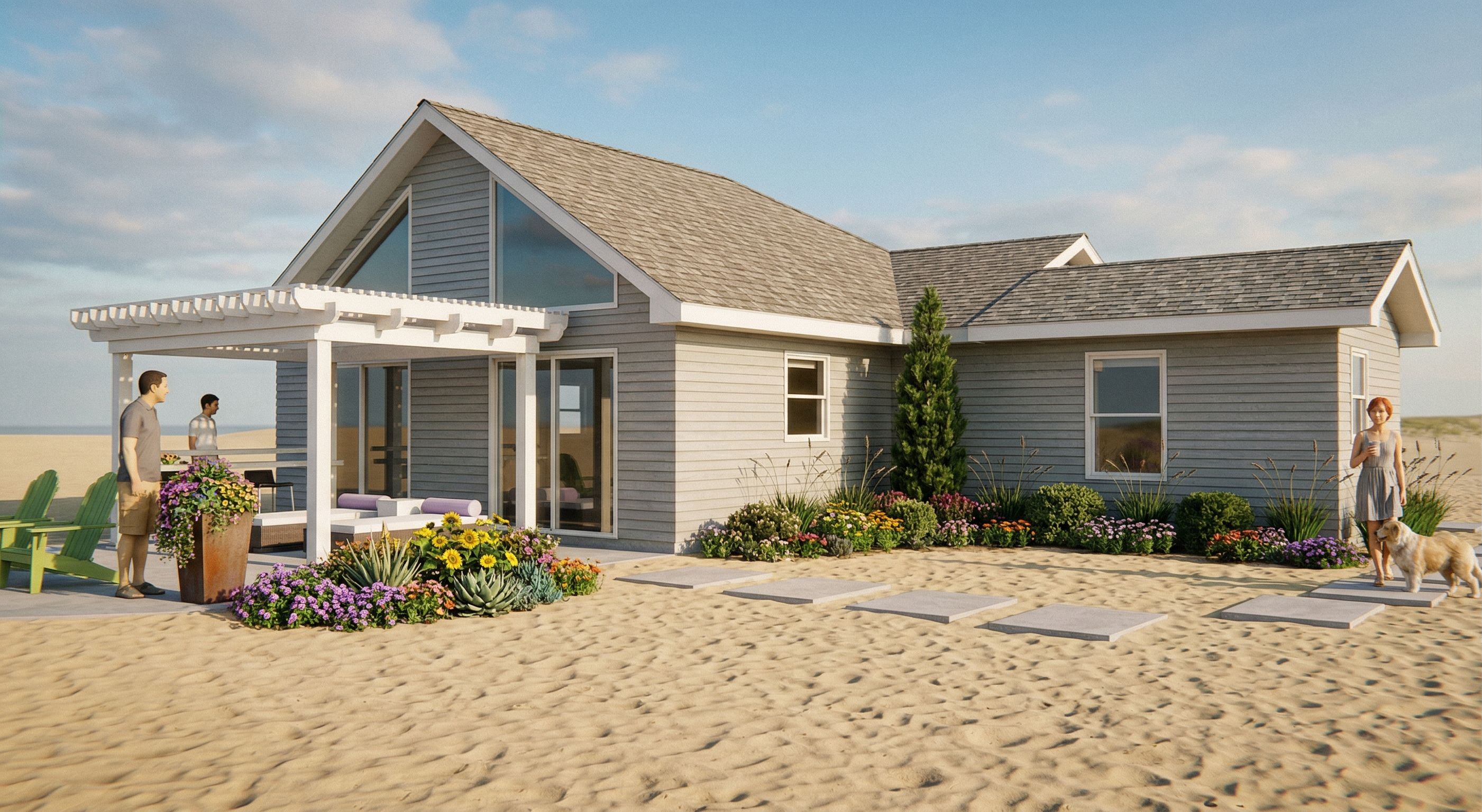 PromptPhoto of a modern beach home single-story residence with a welcoming patio, featuring a white pergola that enhances outdoor living. The exterior showcases light gray lap siding, detailed textures, and large windows. Surrounded by landscaped gardens with vibrant flowers and neatly trimmed shrubs, this home sits in a beach setting, with trees providing a natural backdrop. The scene is bathed in warm afternoon light, creating soft shadows. Captured from a low angle to emphasize the structure, using a wide-angle lens to include both the house and the inviting outdoor space. SAND beach NO trees in background, keep exact camera angle