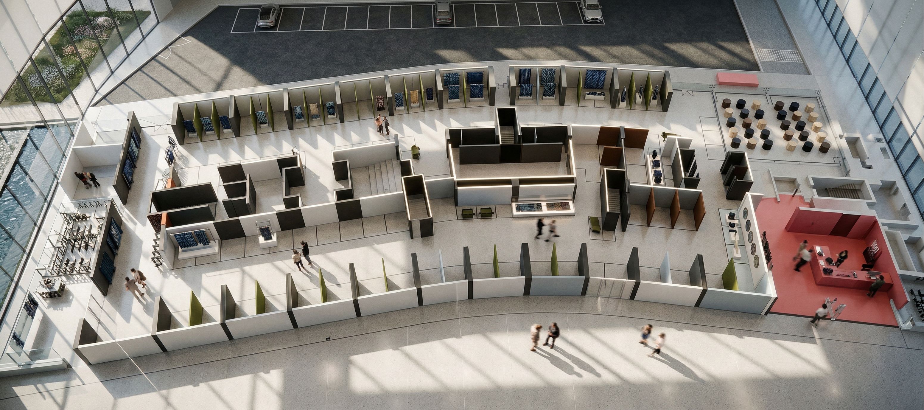 PromptPhoto of a modern adire exhibition layout with distinct zones for various functionalities, showcasing sleek lines and organized spatial arrangements. Emphasize high-quality materials like partitions, all white walls. Natural lighting illuminates the structure, casting dynamic shadows throughout the day. Camera angle from above, reflecting a bird's-eye view, using a wide-angle lens to capture the entire configuration and adjacent environment in crisp detail., keep exact camera angle, keep exact camera angle