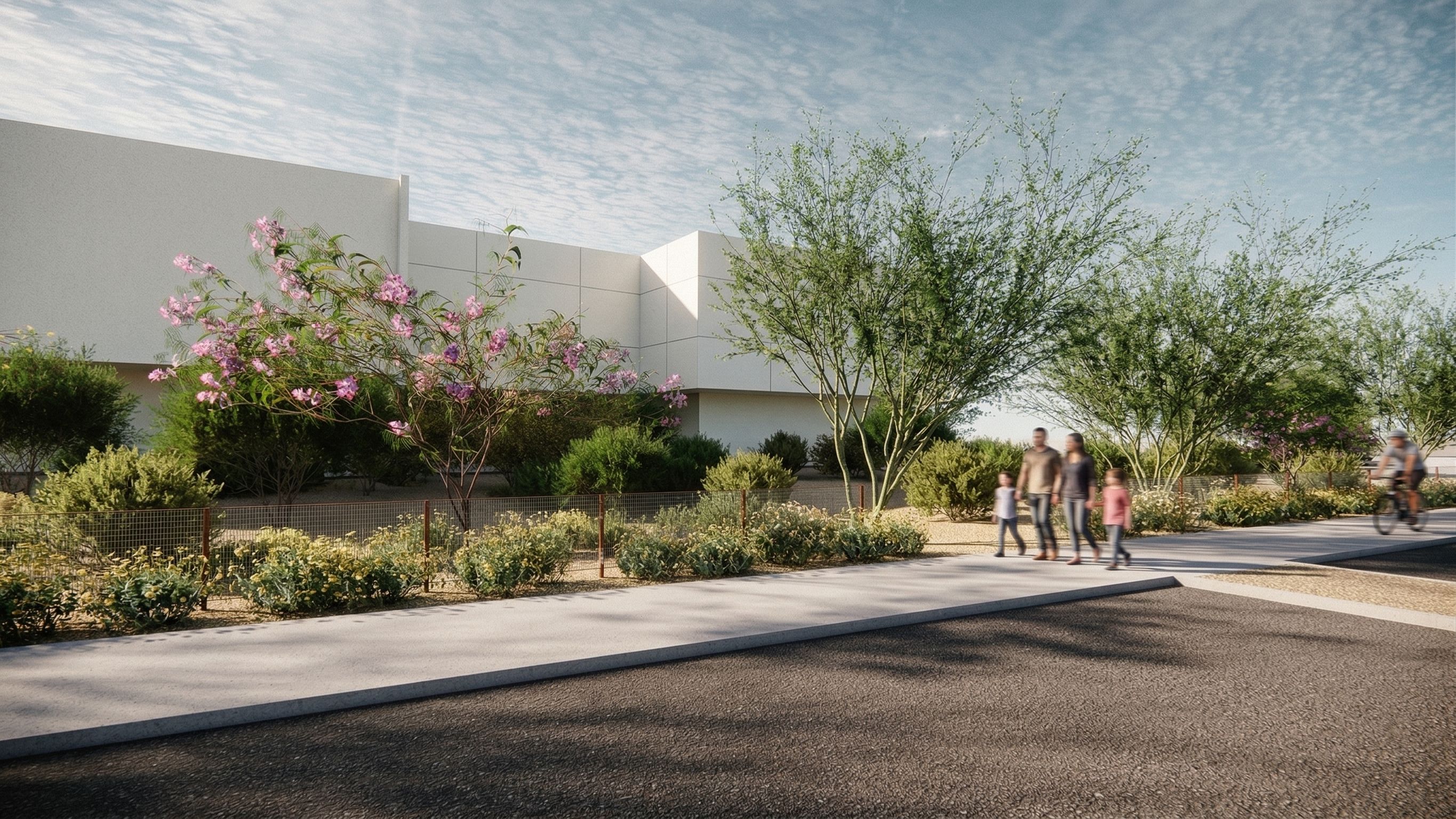 Infill Landscape with Sonoran desert shrub plant palette; Space shrub planting to reflect retention basin spacing and limit palette to large shrubs such as creosote, jojoba, hopbush, etc. Only show brittlebush and bursage shrubs in front of fencing while still showing fence. The fence is the main exhibit which is a steel wire grid fence. , keep exact camera angle