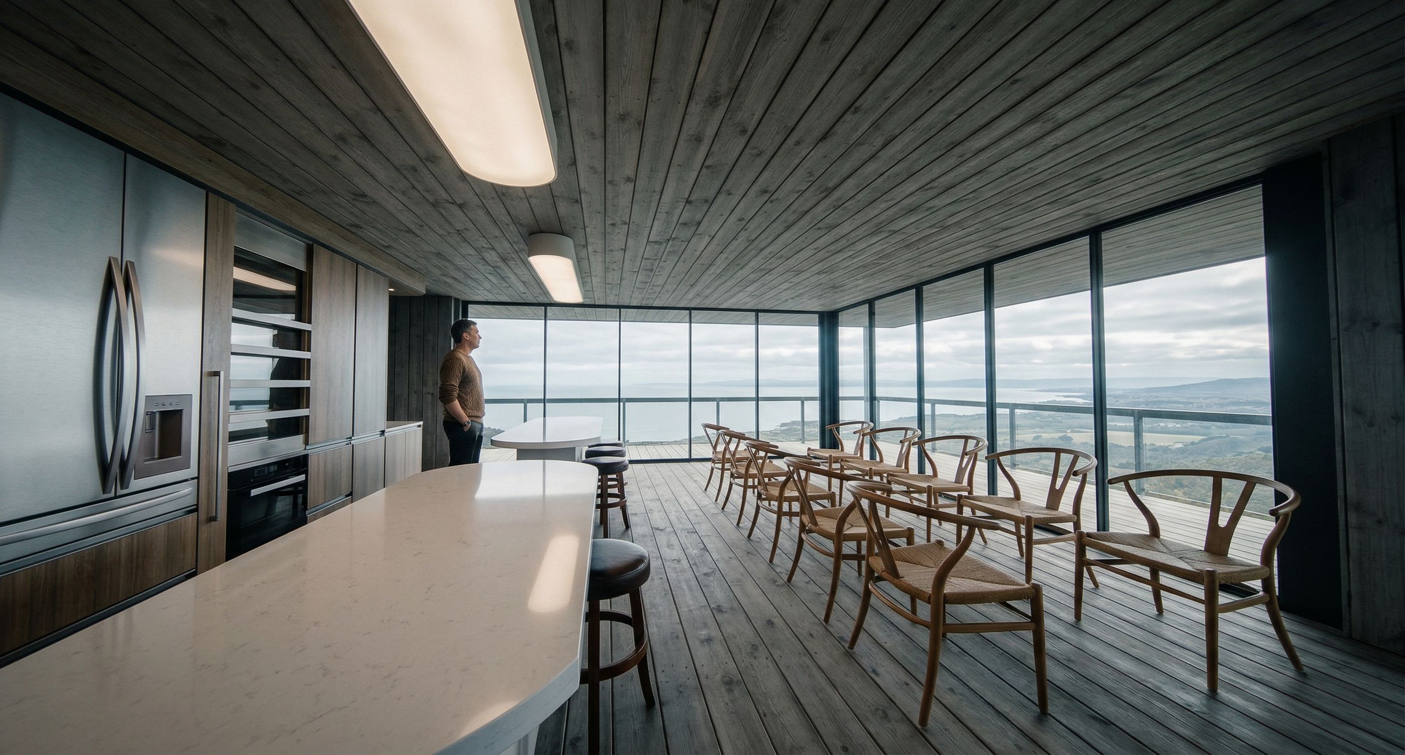 PromptINFINITY FLOOR, AND ROOF, DISTANT SEA AND LANDSCAPE IN THE FAR BEHIND, keep exact camera angle