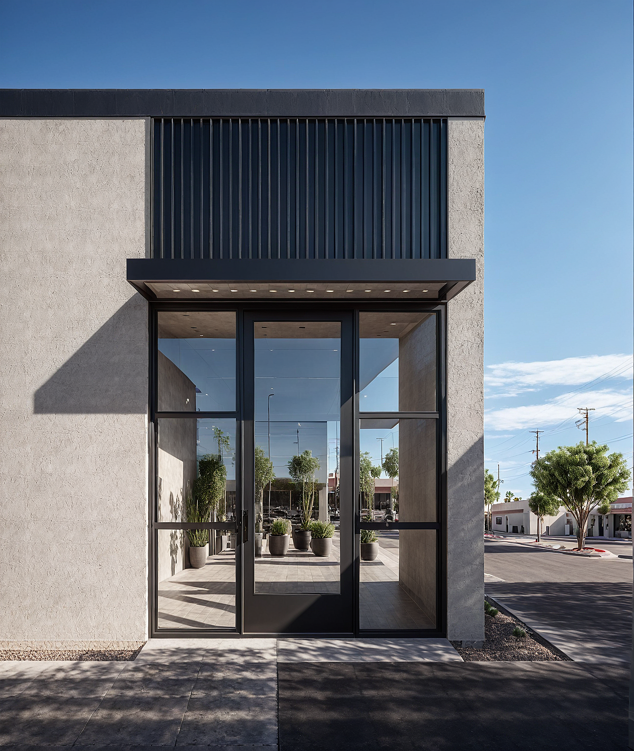 Architectural visualization of a hair salon's shopfront in Phoenix, Arizona, clear sunny sky mood, low planting shrubs, historic neighborhood, smooth concrete walkway.