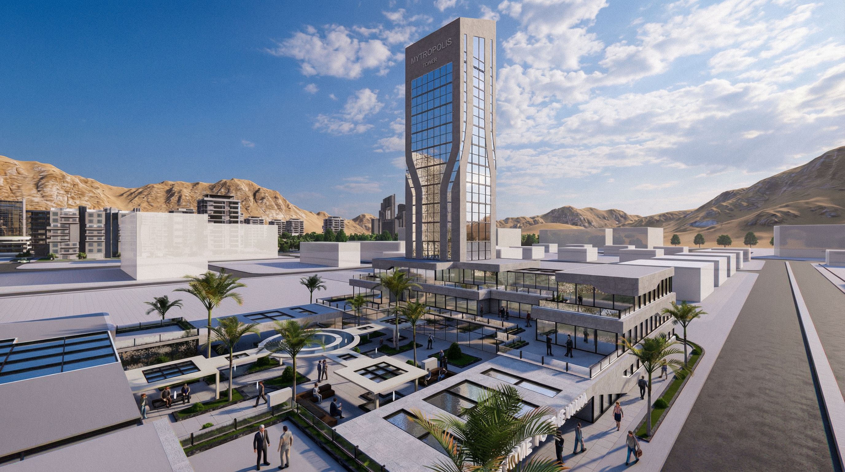 this is a scene of a commercial center and an offices tower.. ... make it super real with people .. enhance the materials without changing the architectural design ... don't change the camera angle and make people real , keep exact camera angle