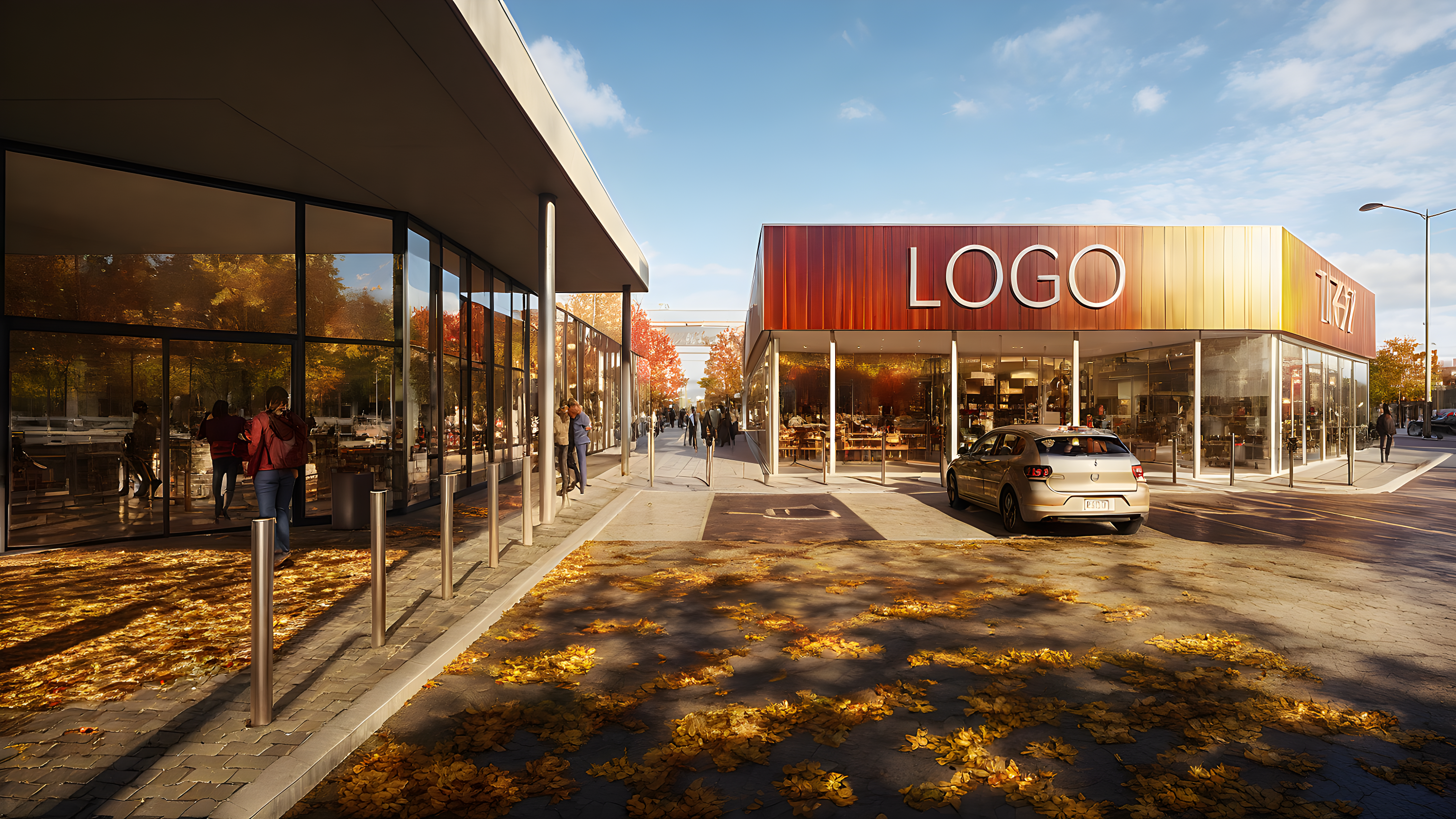 Autumn afternoon at a busy retail shop. Soft golden light shines through trees with rich autumn hues, casting intricate shadows on concrete small tile paving. People of all ages move through the scene, while the shop’s reflective glass windows reflect the vibrant, colorful landscape, adding depth and life to the scene.