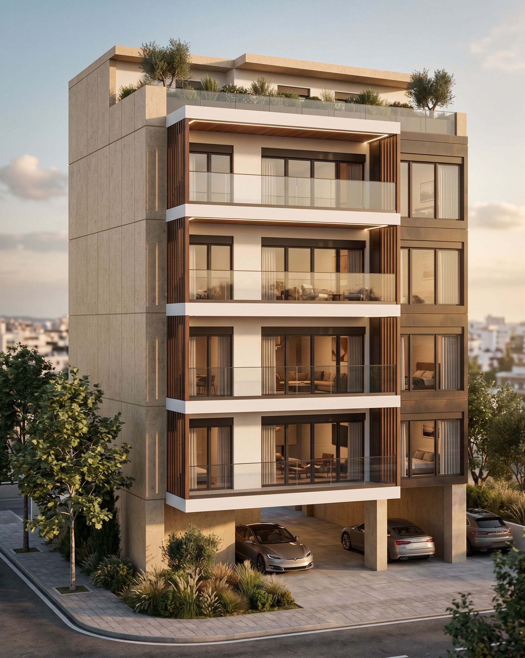 Promptbeige tone building with white balconies, wooden ceiling in balconies and grammical white color in lights in wooden ceiling , more realistic, keep exact camera angle