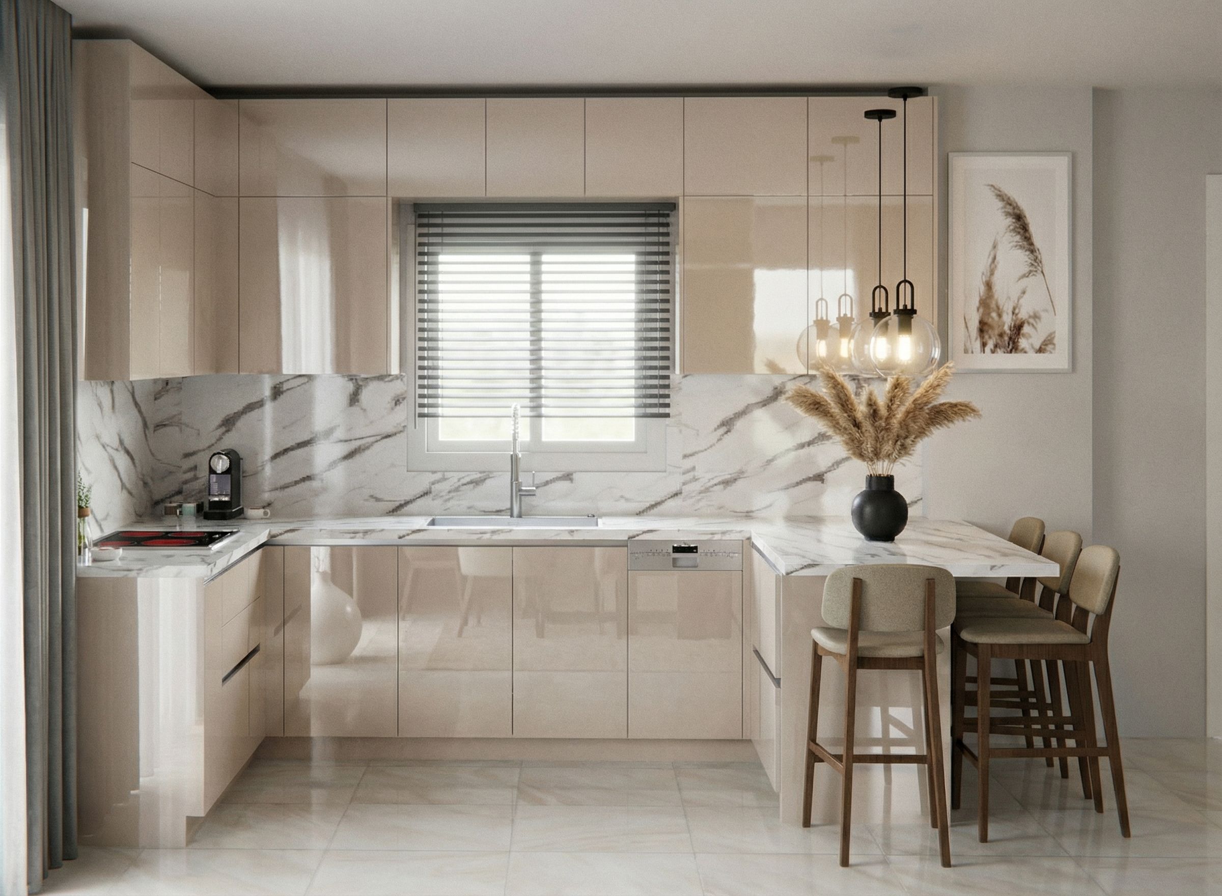 PromptI would like the kitchen doors to remain the normal color they are, but with a lacquer finish and lighting that matches this style. and the kitchen countertop to remain the same colors., keep exact camera angle