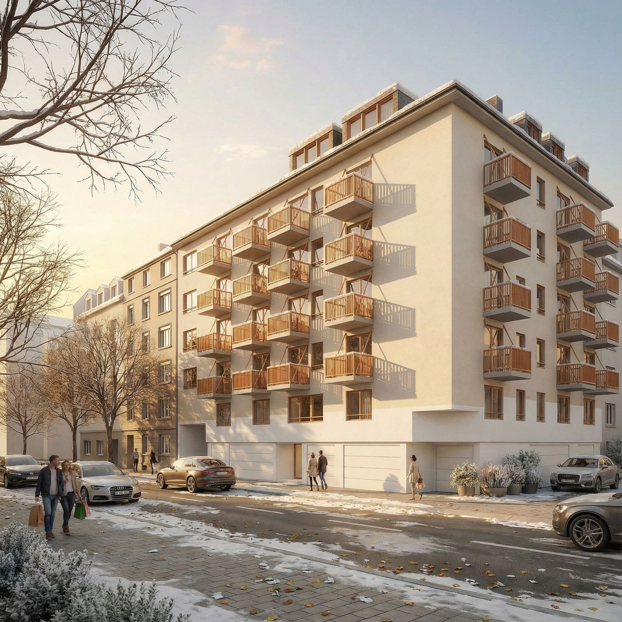 architectural exterior rendering, render this 3D mass into photorealistic rendering, Photorealistic modern sleek residential building located in Zurich, the building stands on an urban paved surrounded by a middle width street with a few realistic dry trees on the other side of the street, with a warm early winter atmosphere, warm sunlight, mix of snow the ground, the first level has white plaster walls , white color as high as the garage doors, keep exact camera angle, golden hour warm lighting, including people, vehicles, greenery and vegetation, trees, high quality, professional, detailed scene