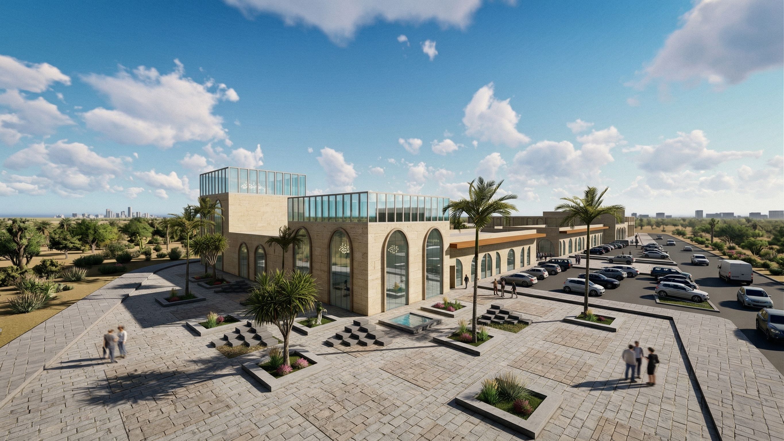 Take the existing image of the commercial building. Do NOT change or modify the architectural design, massing, or proportions in any way. Preserve the original structure exactly as it is. Enhance only the visualization quality: upgrade materials to realistic natural stone, warm wood accents, and clear reflective glass. Improve lighting to be highly realistic and cinematic with natural daylight. Add realistic environment details: parked cars in the parking area, lush trees, greenery, and subtle water reflections if present. Make vegetation and landscape more natural and high-detail. Include people in the scene, but keep them out of focus and slightly blurred to create a realistic depth-of-field effect. They should feel natural, not staged or distracting. Overall style: ultra-photorealistic architectural visualization, high-end rendering quality, realistic shadows, global illumination, and depth of field. Do not alter the original building design.”, keep exact camera angle