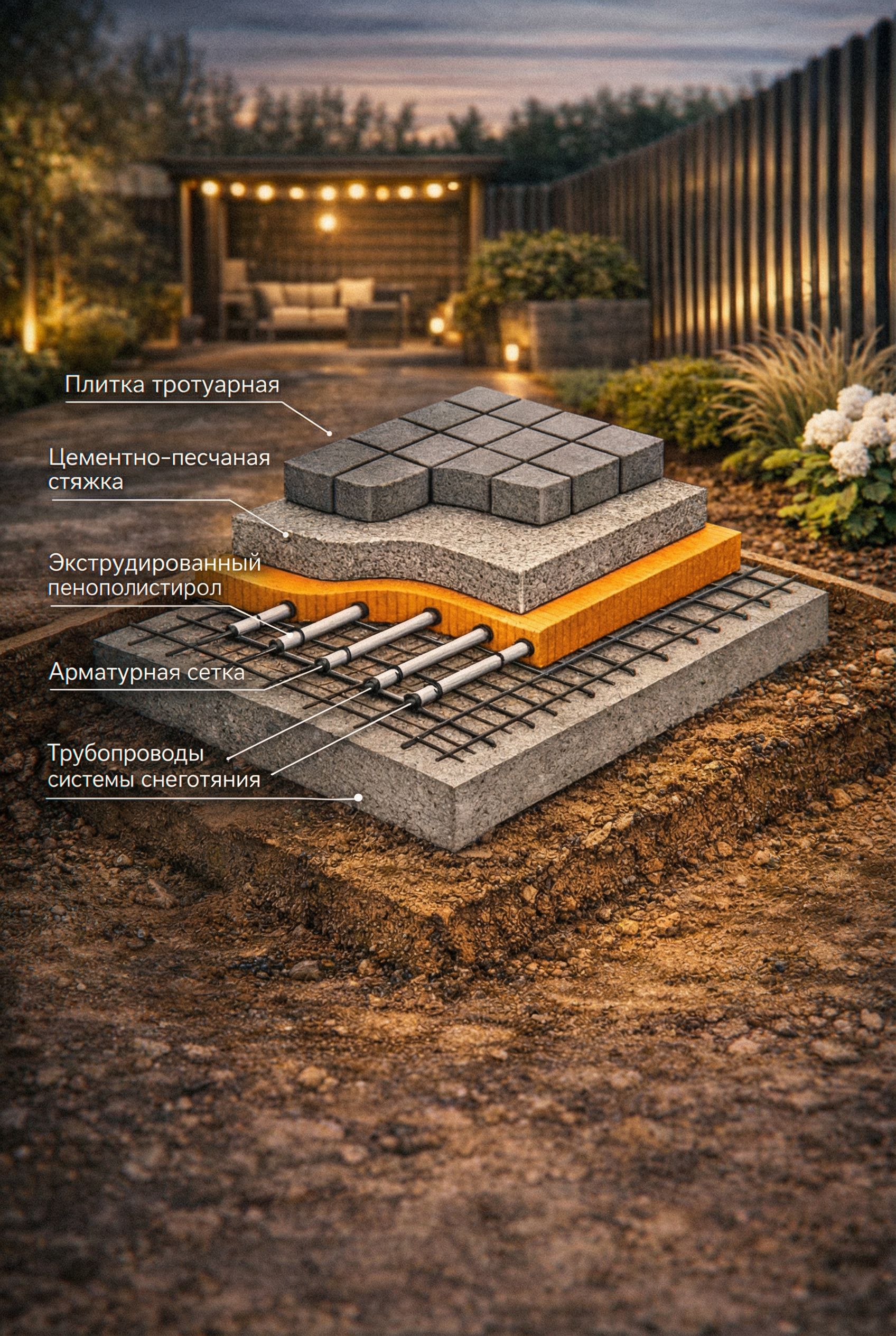 Promptсделай так, чтобы решетка и трубы, которые сейчас под оранжевым слоем встали над ним, то есть были НАД оранжевым слоем аккуратно. из надписей убери следующие вместе со стрелками: хомут, ж/б плита, грунт. первый слой (самый верхний) оставь под названием плитка тротуарная, второй под названием цементно-песчаная стяжка, третий трубопроводы системы снеготаяния (это как раз те трубы, которые ты поднимешь над оранжевым слоем), далее арматурная сетка, которую ты также поднимешь над оранжевым слоем, далее (сам оранжевый слой) под названием экструдированный пенополистирол. рифт и размер текста пусть будет таким же. стрелочки такими же. в остальном картинку не меняй , keep exact camera angle