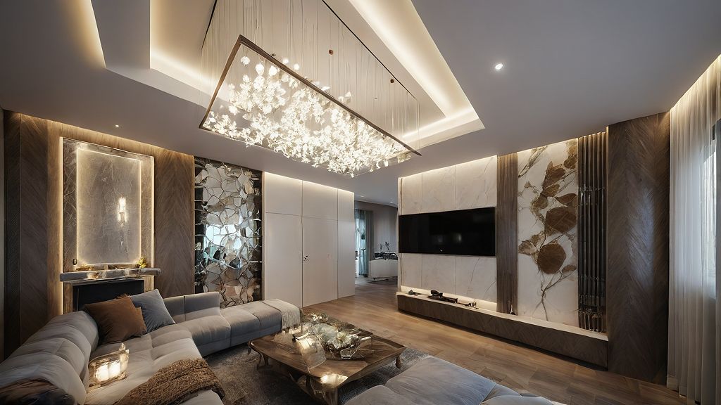 PromptDesign a living room in a classic minimalist style, add hidden lighting, including spotlights on the ceiling.