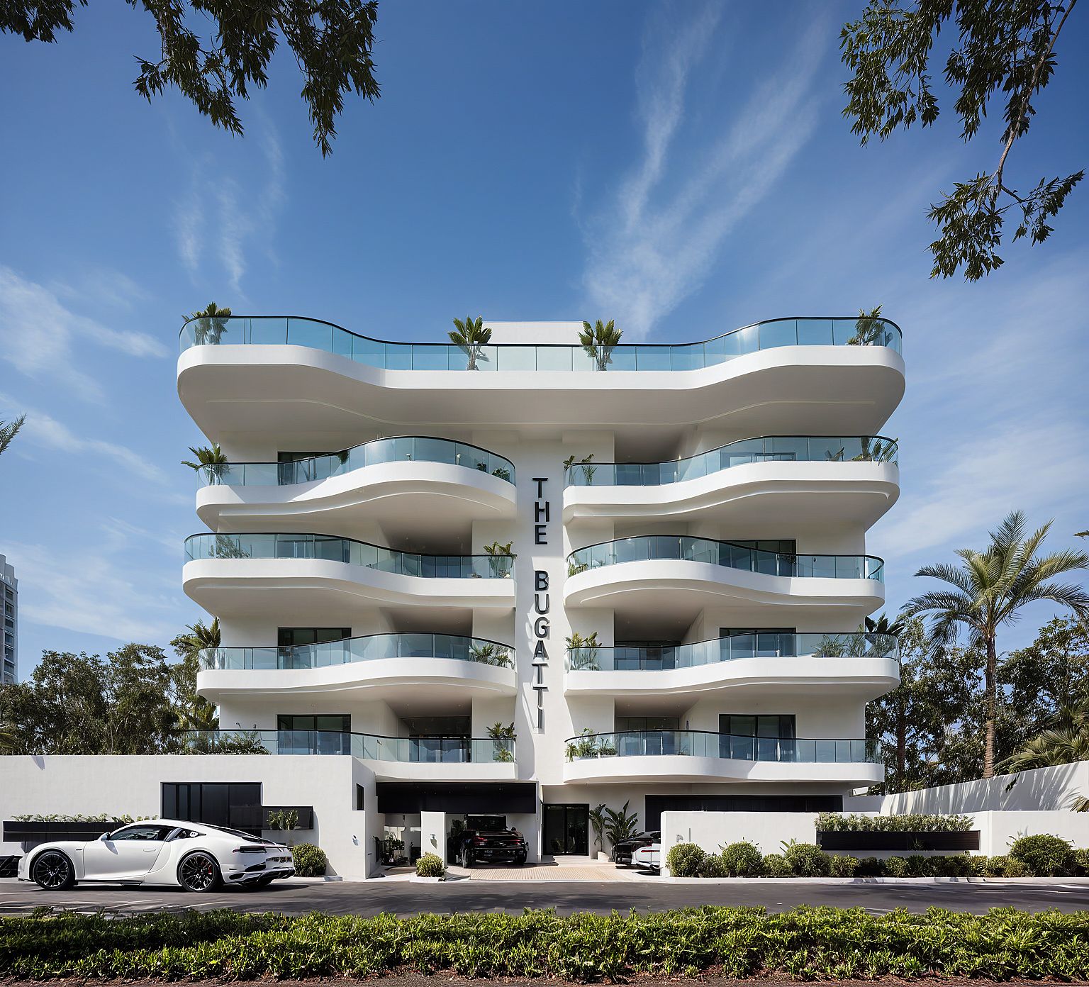 Photo of a modern multi-story residential building with smooth, flowing architectural lines and expansive glass balconies. The design features soft white walls, clear glass rails capped with black, lush greenery, and decorative planters. Set in an urban environment with palm trees, real sky, and luxury vehicles in the foreground. midday sunlight accentuates the textures, casting gentle shadows. Captured from a straight-on perspective, showcasing the entrance prominently while emphasizing the overall symmetry of the facade. At the center of the building is a bold black vertically written text, " THE BUGATTI"