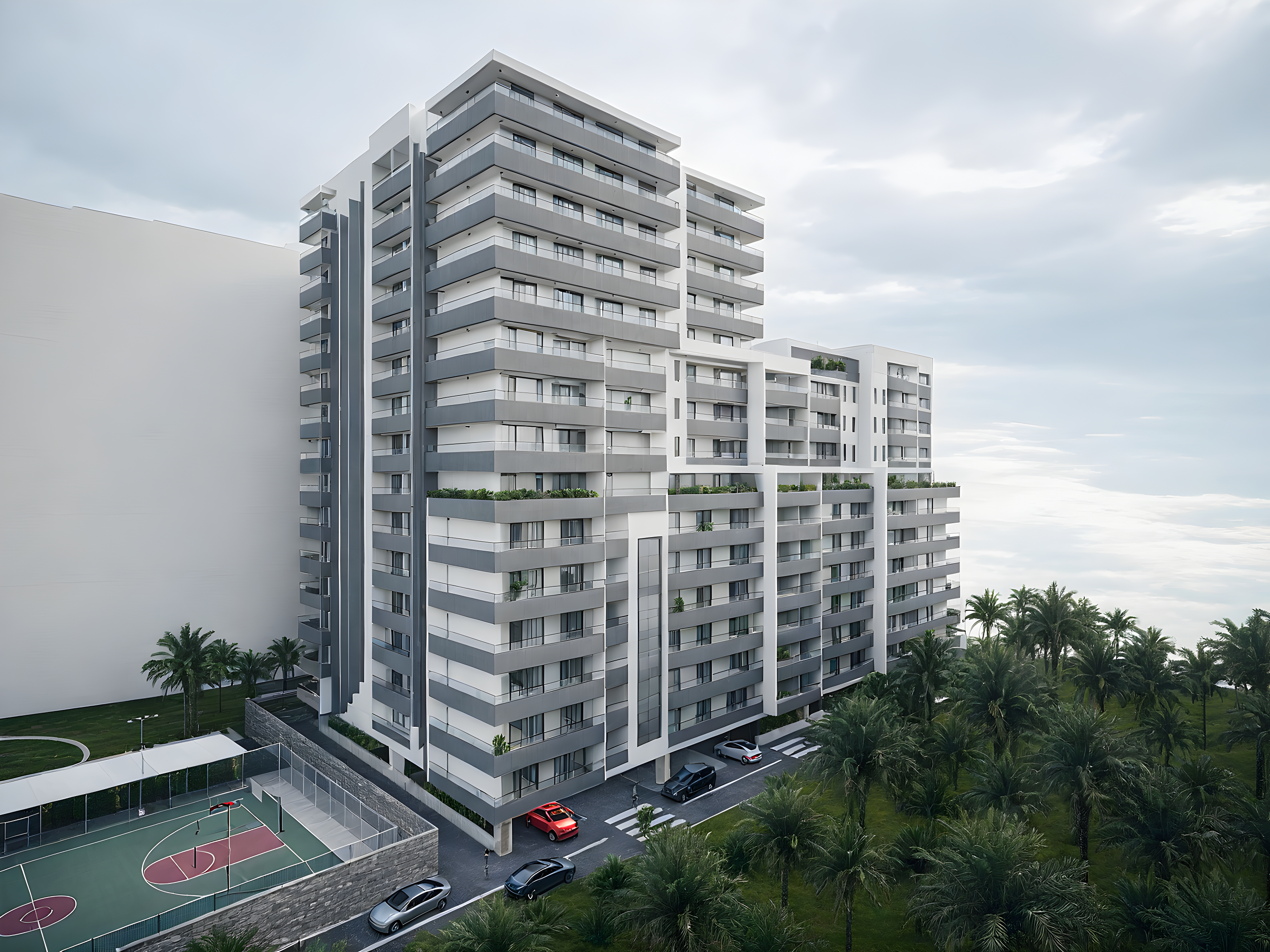 Promptcolored basketball court, grey hotel, everything else colored, trees with grass