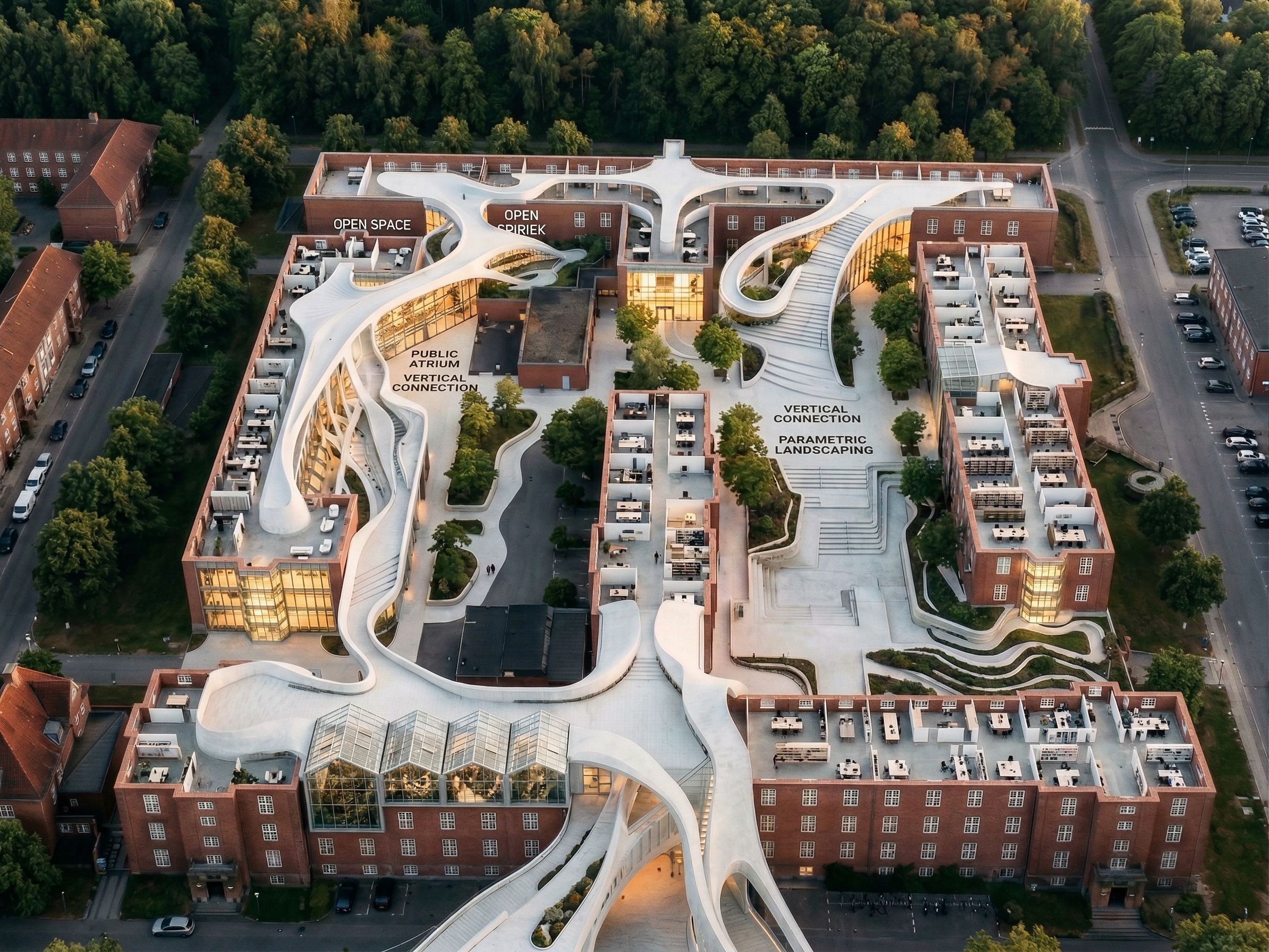 PromptCREATE A FIRST FLOOR LEVEL HORIZONTAL SECTION OF THIS BUILDING, BASED ON THE ATTACHED FLOOR PLAN IN REFERENCE IMAGE2., keep exact camera angle