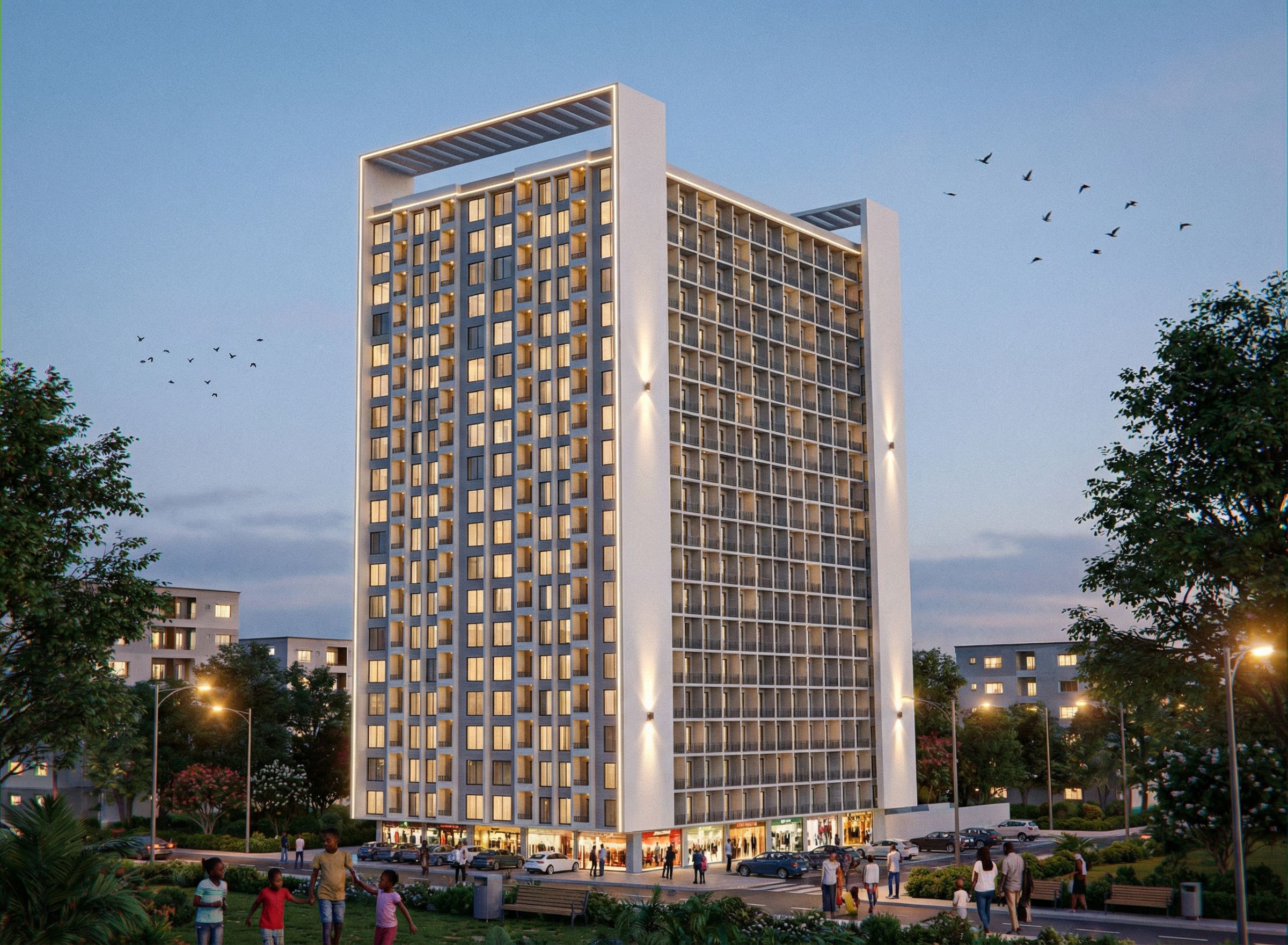 Render in a residential suburb. MAKE GLASS CLEAR, REALISTIC AND REFLECTIVE. PUT SHOPS ON GROUND FLOOR WITH PARKING INFRONT OF IT. USE PEARL WHITE WALL MASTER ON THE BUILDING. HAVE SOME BIRDS IN THE SKY AND PEOPLE OF AFRICAN ORIGIN AND KIDS PLAYING IN THE FOREGROUND. INCLUDE SOME SPOT LIGHTS, ROPE LIGHTS AND STREET LIGHTS IN THE BUILDING. USE A MIX OF BRILLIANT WHITE AND PASTEL GREY IN THE BUILDING. TURN ON THE LIGHTS., keep exact camera angle