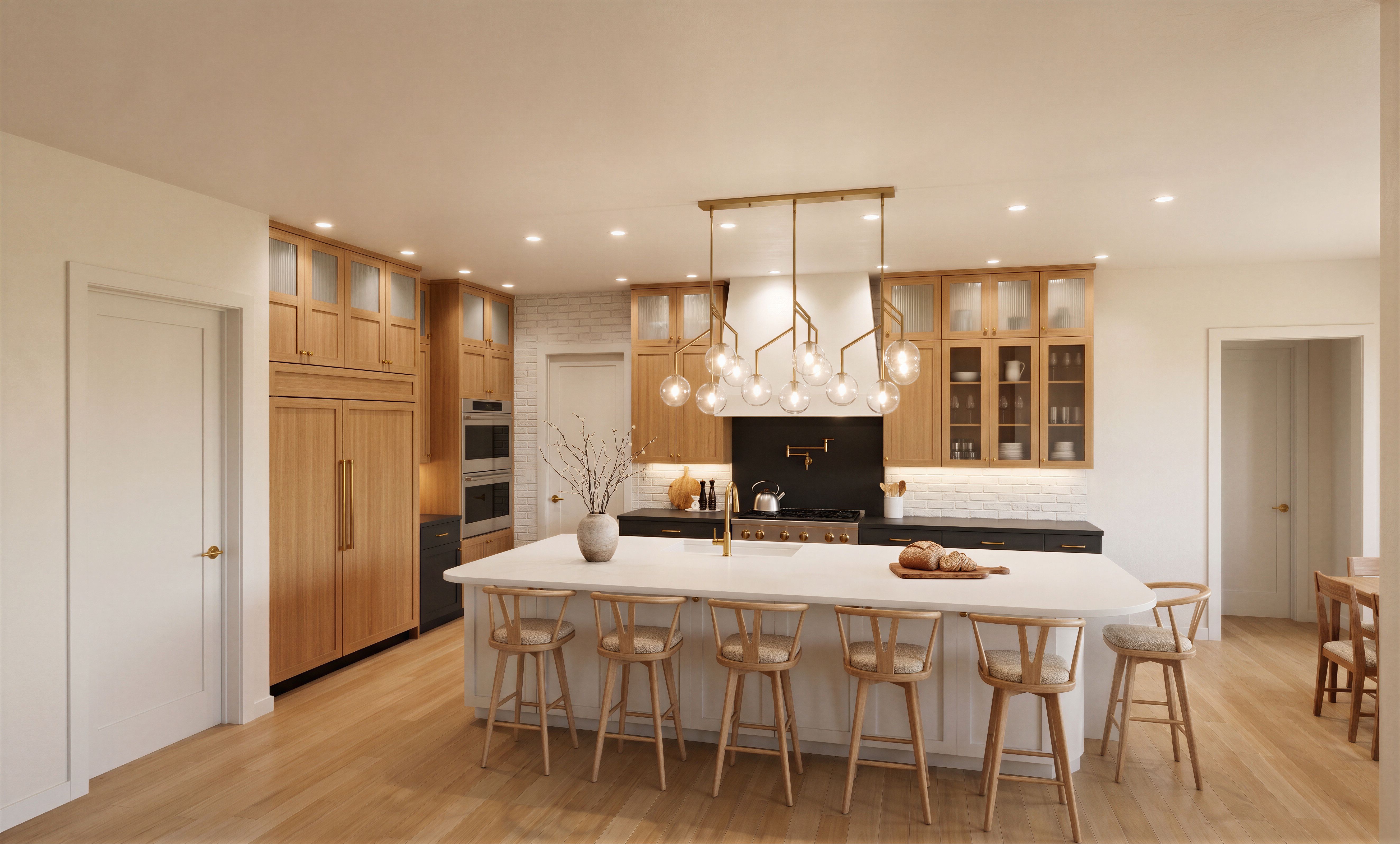 make photorealistic rendering of this kitchen; light fixtures on, bright room, slightly warm colors; do not open door, which are not opened; lower wall cabinets have no glass, but the one on the right; very top cabinets at the ceiling have opaque glass, but no glass in the cabinet over the hood; do not add cabinets which are not there; do not add chairs and table which are not there; Change colors and materials per Reference Image 1;, keep exact camera angle