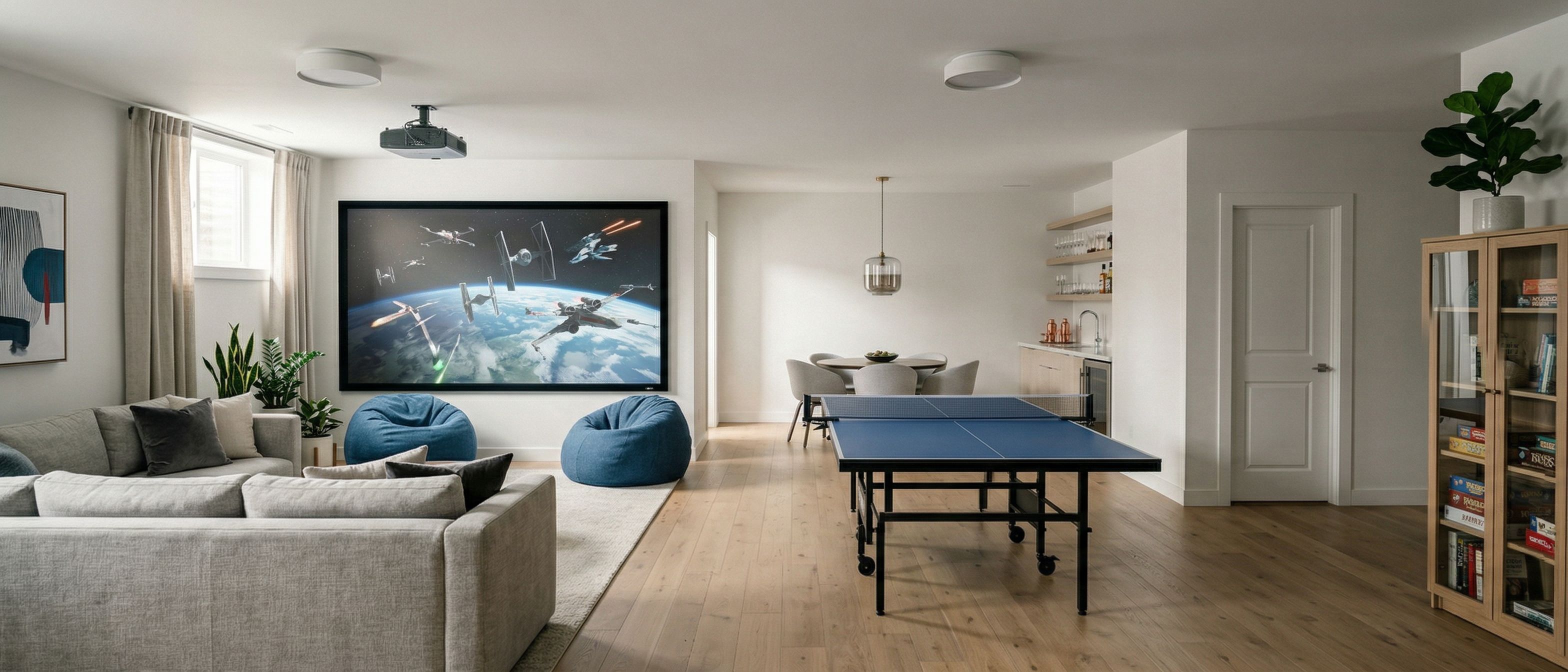 Photo of a modern recreational room featuring a ping pong table, cozy bean bags, and a relaxed seating area. Architectural elements include sleek lines and minimalistic design, with a light wood floor enhancing the spacious feel. The room is illuminated by natural light streaming through a window, creating soft shadows. A wide-angle view captures the interior layout, with a focus on the connection between seating and activity areas, enhancing the inviting atmosphere of leisure and relaxation. Curtains on the windows in the theatre area, show a star wars film playing, add floating shelves with glass in bar area over the sink, white doors, decorated nice, keep exact camera angle