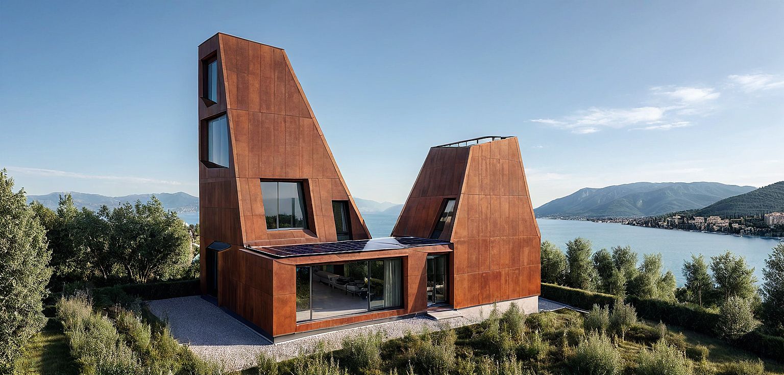 Promptbuilding structure is x-lam panel with load bearing wall exterior facade is covered with cor-ten alluminium that has bronze orange brown color , One big tower and one small tower. Two towers all have windows which all are bow windows with simple design, on the first floor there is living room with big window. There is terrace on the second floor between two towers . top of the tower have a skylight window with solar panel . Building is located in Verona Malcesine, on the little hill in the middle of the trees and grasses
