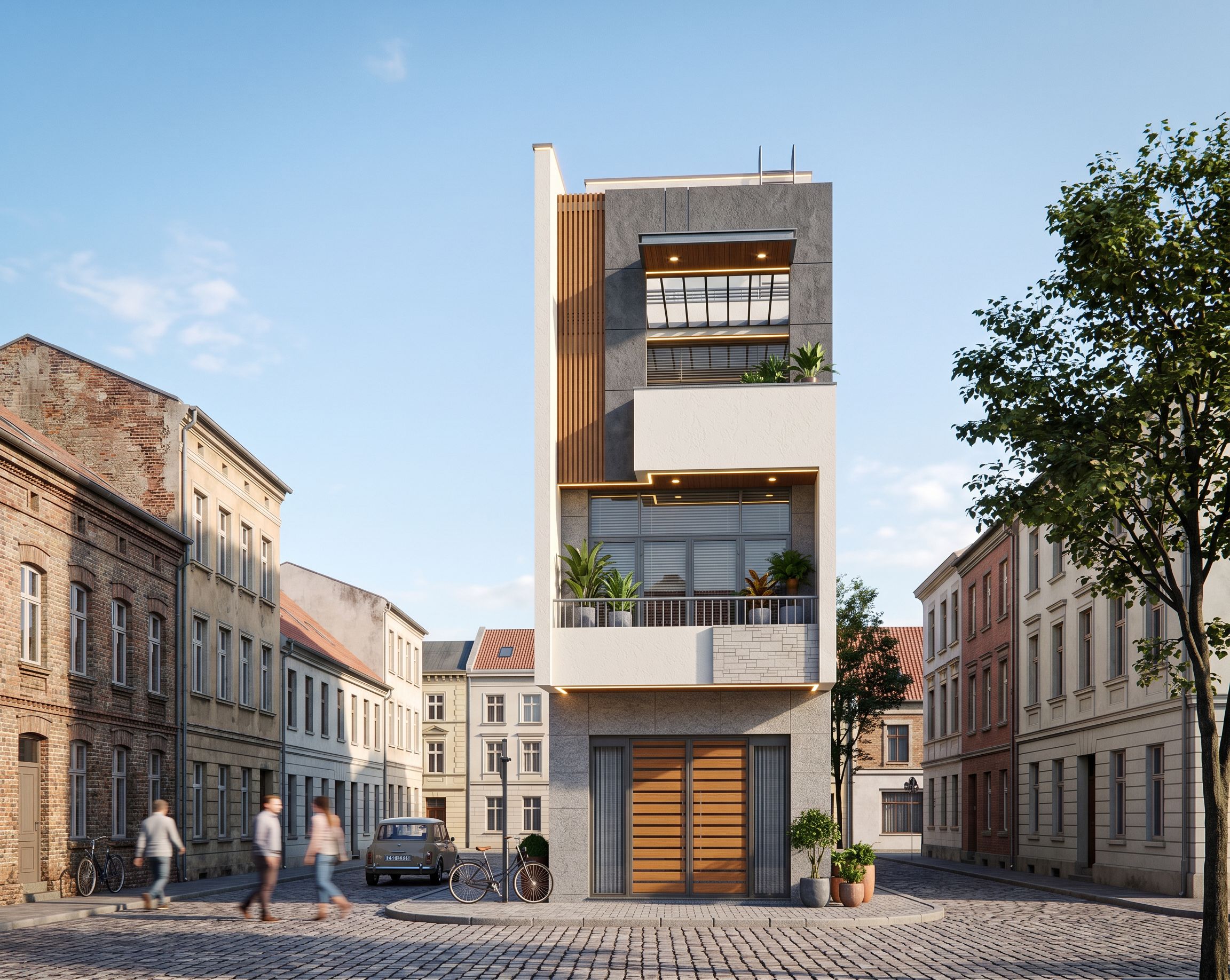 PromptThe photograph depicts a modern apartment building with a sleek facade, combining textured ivory paint, concrete, glass, subtle textured grey stone cladding on the ground floor, and wood accents. Prominent architectural details include large floor-to-ceiling windows with interior blinds, partially covered balconies, and horizontal wooden slats creating a surface effect. Strategically placed LED lighting is installed under the balconies and on the roof. Potted plants adorn the balconies. Against the urban backdrop, the building faces a cobblestone street lined with 2-3 story buildings, creating a vibrant cityscape that highlights the modern design. Soft natural light in the early morning creates gentle shadows, which, combined with interior lighting, accentuate the architectural elements. The unique design and wide-angle lens used in the photograph highlight the building's details while adding depth to the surrounding environment., keep exact camera angle