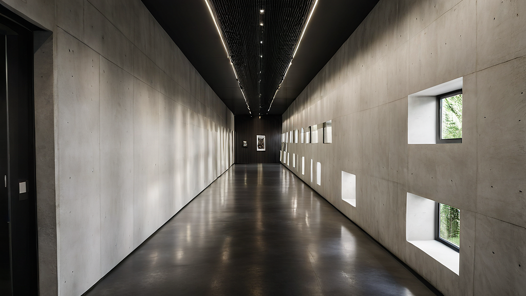 Promptit is a hallway of a museum, with windows to a forest on the right wall. the walls are white concrete. it is dark