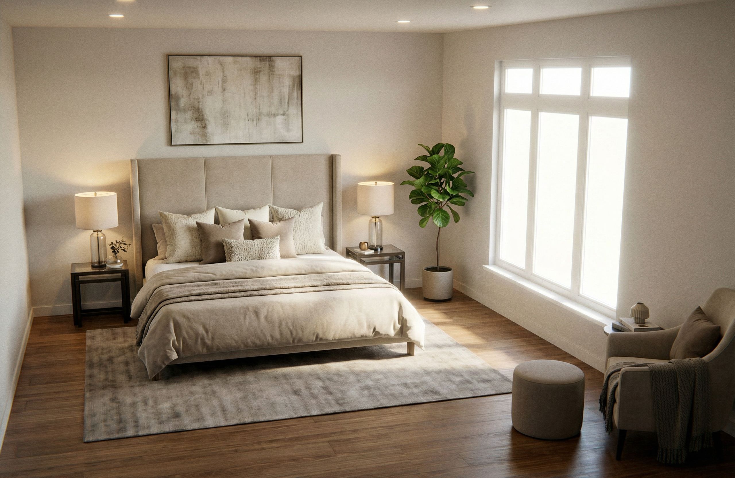 PromptPhoto of a LUXERY bedroom featuring a central bed with a plush, neutral-toned comforter and decorative pillows. Architectural details include sleek wooden flooring and minimalistic bedside tables with elegant lamps. The large windows allow natural light to illuminate the space, casting soft shadows. The room is framed from a slightly elevated angle, emphasizing the depth and openness of the layout, while using a wide-angle lens to capture the entire room in a cohesive manner., keep exact camera angle
