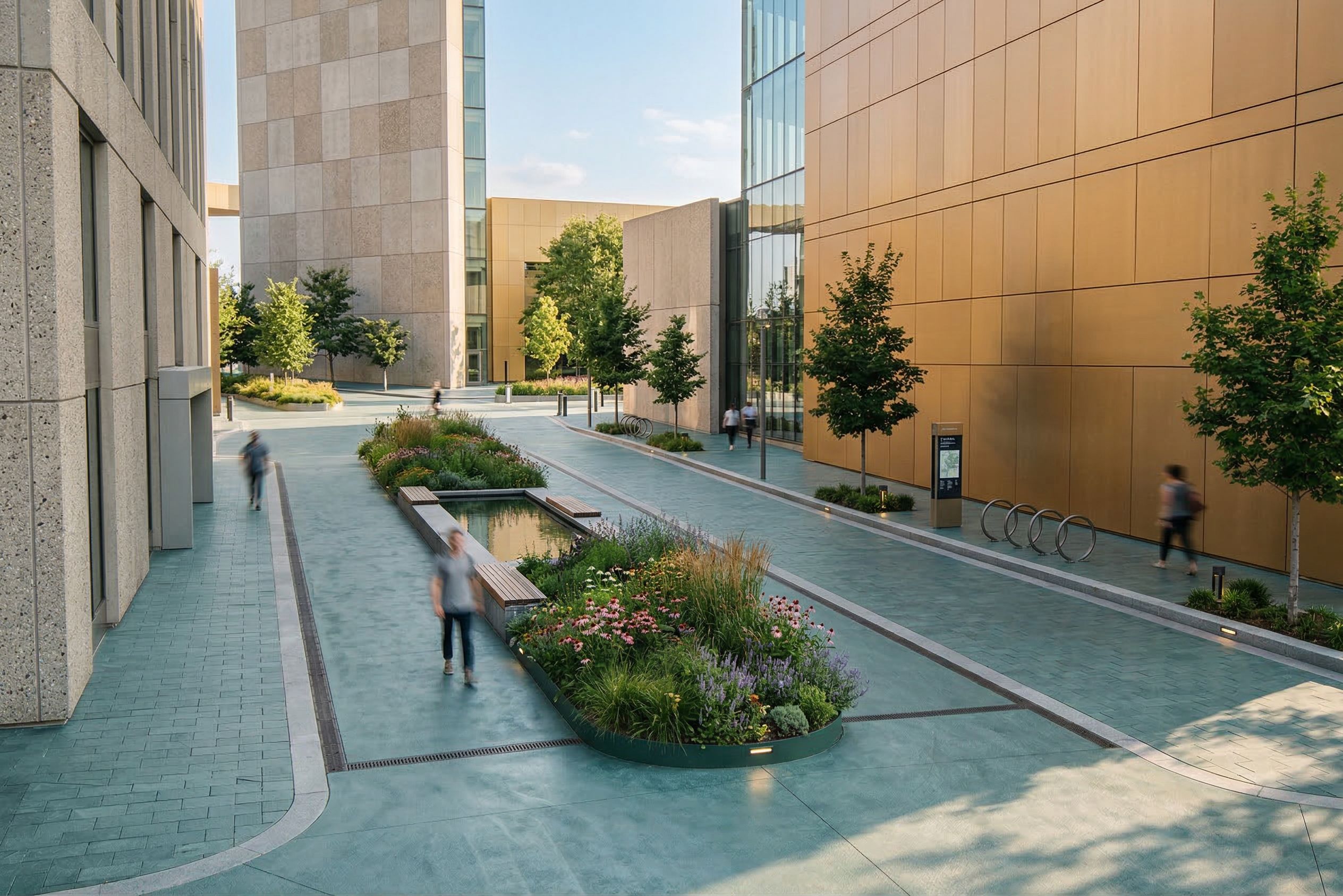 Prompteye-level architectural visualization of a pedestrian moving through an urban landscape designed for environmental remediation, preserving the exact geometry and layout of the original design without any alterations. All buildings and surrounding structures must maintain their original form and massing exactly as provided, with no geometric changes, only enhanced through realistic materials and textures. The environment is newly designed, clean, and aesthetically pleasing, with a cohesive and intentional composition. Outdoor spaces feature integrated ecological planting, including native grasses, flowering gardens, and phytoremediation landscapes that help restore the soil. Curated garden areas with seating, small plazas, and intimate outdoor rooms create a warm and inviting atmosphere. Trees are strategically placed to provide shade and define space, casting soft dappled shadows. Water features are calm and reflective, integrated naturally within the landscape system. Surrounding buildings in concrete, glass, and subtle terracotta brick frame the space without dominating it. Soft warm daylight, realistic shadows, high-end architectural visualization, cohesive, intentional, and visually pleasing urban design