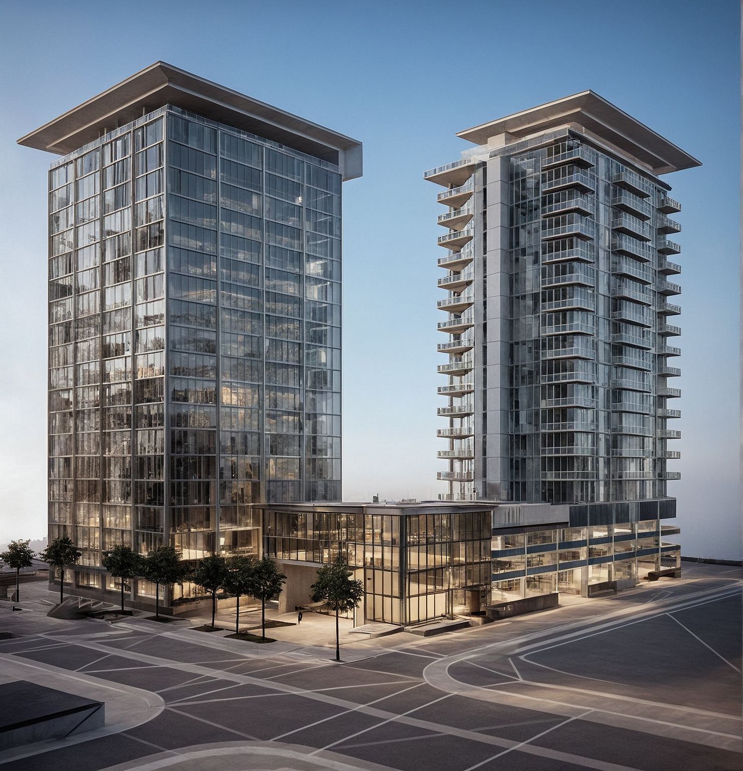 Promptmodern contemporary building, with glass and photorealistic texture, ambient warm sunshine with bold and clean lines, the building should be modern, add plants on the balconies and make the glass of the building , place short shrubs and trees only on corner edge of the balcony of the second building, make the glass of the building dark and add contrast on the building to make sure each floor can be seen clearly