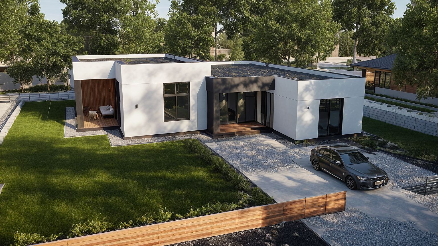 Photo of a modern single-family home with a flat roof and contrasting materials. Emphasize smooth stucco walls and sleek metal accents, a spacious wooden deck with stylish outdoor furniture. Surrounding the home are lush green lawns and mature trees, with a gravel driveway leading to a parked car. Captured during soft afternoon light, creating gentle shadows and highlights on the façade. Utilize an aerial perspective from a high-angle view to showcase the layout and landscaping, with a wide-angle lens to enhance the sense of space and integration with the environment. Ultra realistic