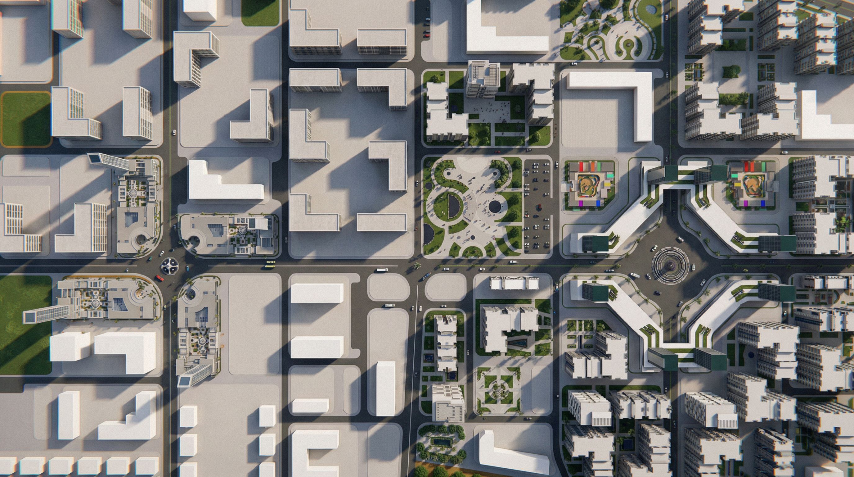 PromptPhoto of a modern urban architectural layout showcasing clustered buildings with minimalistic designs. Emphasize the clean lines and uniform façade materials in the structures. The surrounding environment includes landscaped green parks and circular roads, enhancing the urban atmosphere. Natural daylight casts soft shadows across the scene, illuminating the textures of the surfaces. Aerial perspective captures the grid-like arrangement of the buildings, focusing on the symmetry and geometric patterns, with a wide-angle view to showcase the expansive urban context., keep exact camera angle