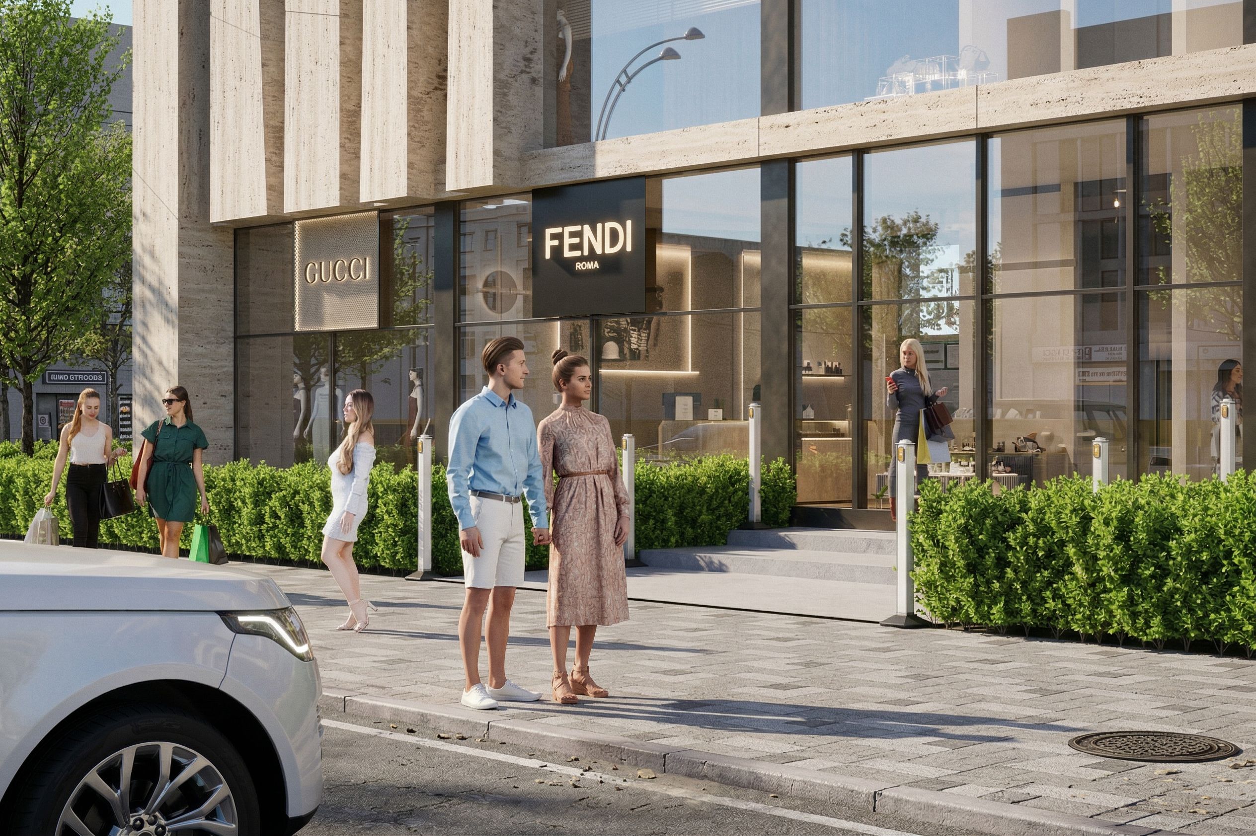 Enhance this modern commercial building render to ultra photorealistic quality while keeping the exact original architecture, massing, proportions, and details unchanged. Do not modify the building design in any way. Apply highly realistic materials: - light beige travertine stone with natural imperfections and subtle weathering - dark vertical metal panels with soft reflections - large clear glass with realistic reflections, with visible interior depth and lighting Improve lighting to natural spring daylight with cinematic soft shadows, global illumination, and balanced exposure. Add a realistic sun direction with warm highlights and soft sky reflections. Enhance the surrounding environment: - realistic asphalt and sidewalk textures with natural imperfections - more natural greenery and detailed bushes - subtle wind effect on trees Upgrade all elements to realism: - realistic people with natural poses and accurate shadows no blur, no distortion - cars with accurate reflections, rear lights, and contact shadows - a clean but slightly imperfect urban scene Refine details: - realistic shopfront lighting and reflections - glass transparency with visible interior depth - sharp but natural edges no over-sharpening - physically accurate materials PBR workflow Camera & render: - cinematic composition - very subtle depth of field - high dynamic range HDR - ultra high resolution, 8K, ray tracing, global illumination IMPORTANT: Do NOT change the design, structure, or facade composition. Do NOT add or remove any architectural elements. Only enhance realism, lighting, and materials., keep exact camera angle