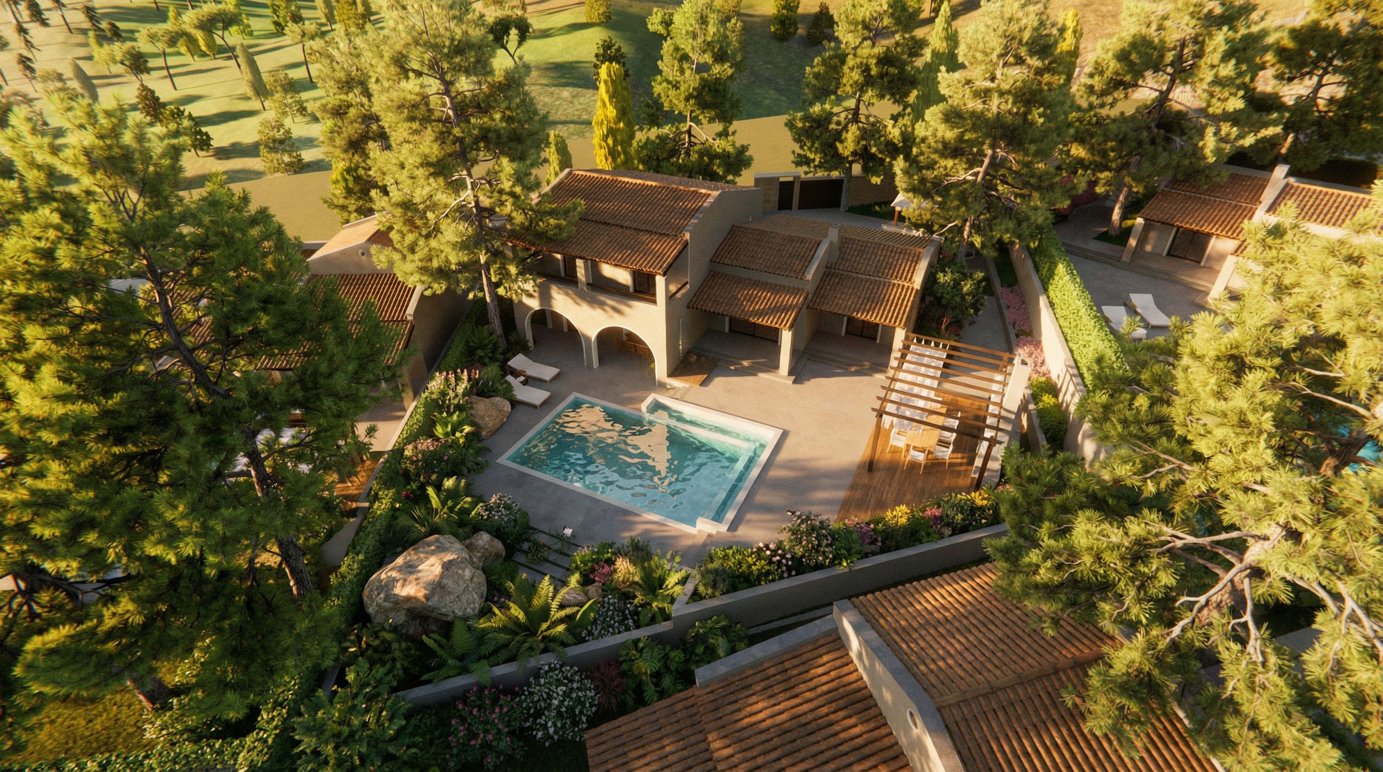 Photo of a modern residential villa, showcasing a seamless blend of natural materials like stone and wood. Surrounded by lush greenery, the outdoor area features a serene swimming pool and a wooden patio. Soft morning light casts gentle shadows, enhancing the textures of the roof tiles and stucco walls. Captured from a high angle, emphasizing the layout and integration of the pool with the landscape, using a wide-angle lens to create depth and a sense of space. Put Water only in swimming pool, keep exact camera angle