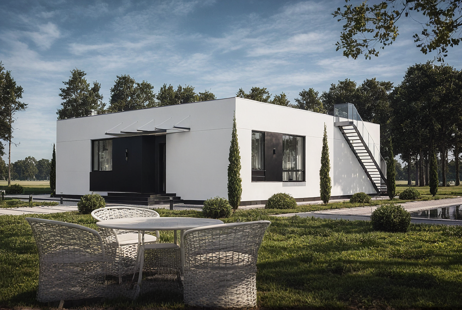 Promptvery realistic photo, sunny day, like it, beautiful surroundings, white house with dark panels