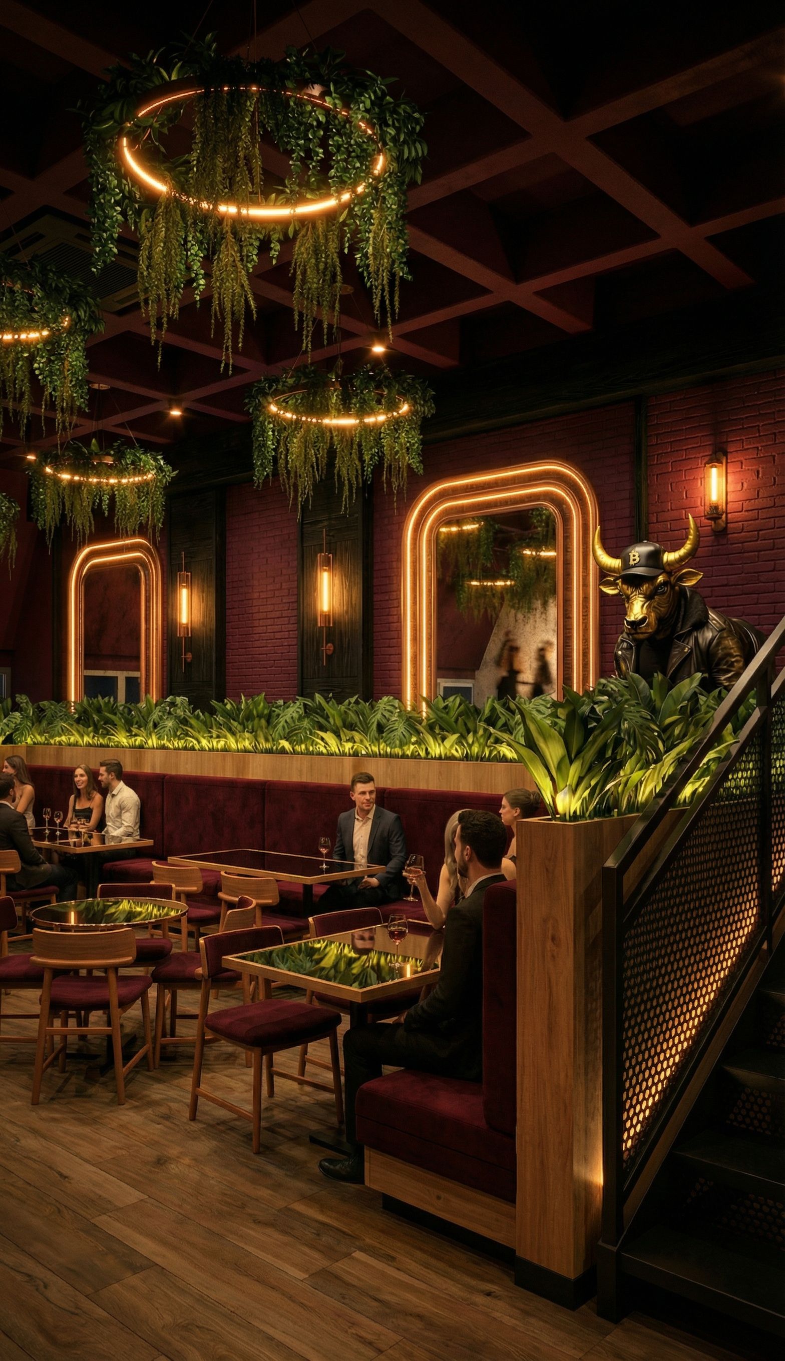 Generate a render in the perspective of the uploaded image, using the widest lens. HIGH-END PHOTOREALISTIC INTERIOR RENDER OF A MODERN CANTINA RESTAURANT NAMED BRASA NEGRA.NIGHTTIME ATMOSPHERE WITH AN ELEGANT, VIBRANT AND FESTIVE BAR MOOD INSPIRED BY GLOWING EMBERS AND FIRE GRILLING. DARK AND SOPHISTICATED ENVIROMENT WITH WARM AMBER AND COOPER LIGHTING ACCENTS THAT CREATE A LIVELY NIGHTLIFE EXPIREINCE. CERAMIC WOOD-LOOK FLOORING IN 18X60 CM PLANKS. LUXURY BOOTHS UPHOLSTERED IN AGED VELVET FABRIC IN WINE COLOR, COMBINED WITH NATURAL LIGHT BROWN WOOD BACKRESTS AND ARTIFICIAL GREENERY ABOVE THE BOOTHS. EXPOSED WINE COLOR CONCRETE WAFFLE SLAB CEILING WITH DRAMATIC SHADOWS. WINE COLOR PAINTED BRICK FEATURE WALL FOR DEPTH AND CONTRAST. TV WALL FRAMED SHOU SIGU BAN CHARRED WOOD PANELS. VINTAGE WALL LAMPS ON BOTH SIDES EMITING WARM, LOW LEVEL LIGHT. TWO ARCHITECTURAL ARCHES MADE OF 2-INCH METAL TUBING PAINTED COOPER, SIDE-LIT WITH AMBER LED STRIP LIGHTING, WITH AGED MIRROR BACKGROUND REFLECTING WARM LIGHT AND MOVEMENT.SUSPENDED CIRCULAR CEILING STRUCTURES WITH ARTIFICIAL PLANTS AND INTEGRATED WARM LED LIGHTING, CREATING A FLOATING GARDEN EFFECT, STAIRCASE SIDE COVERED WITH BLACK PERFORATED METAL SHEET, SUBTLY BLACKLIT. Bull sculpture next to railing similar to the one shown in the photo, made of steel and metal. Tables with mirrored tops and wooden chairs in the same tone as the back of the booth. CINEMATIC LIGHTING, HIGH CONTRAST, REALISTIC REFLECTIONS, DEPTH OF FIELD. LUXURY NIGHTLIFE HOSPITALITY DESIGN, ULTRA DETAILED MATERIALS, PREMIUM TEXTURES, PROFESSIONAL ARCHITECTURALVISUALIZATION, remove dj set.,8K QUALITY, keep exact camera angle