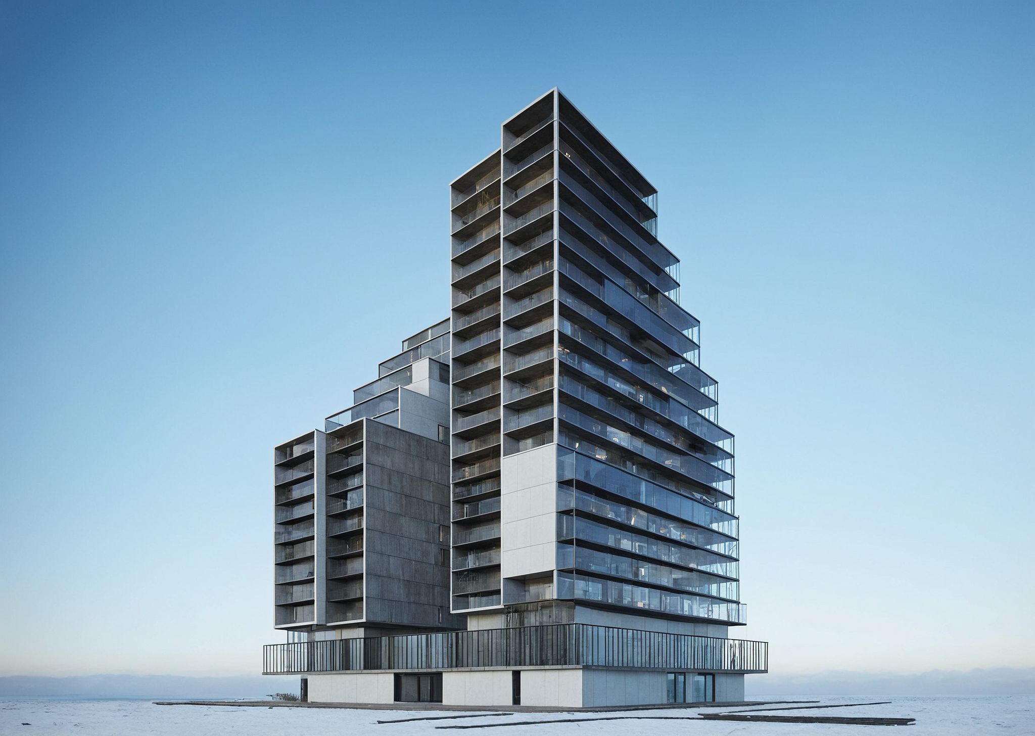 PromptUltra-realistic rendering of a modern residential high-rise tower. The façade is not a full curtain wall, but a mix of glass and solid walls. Large windows and balconies alternate with solid concrete and textured wall panels, arranged in a random but harmonious pattern across the façade. The design emphasizes residential scale: vertical and horizontal divisions, rhythm, and variety. Balconies with glass or metal railings are integrated for each unit. Materials include concrete, stone panels, and glass, with a balance between transparency and opacity. Contemporary style, photorealistic rendering, urban context.