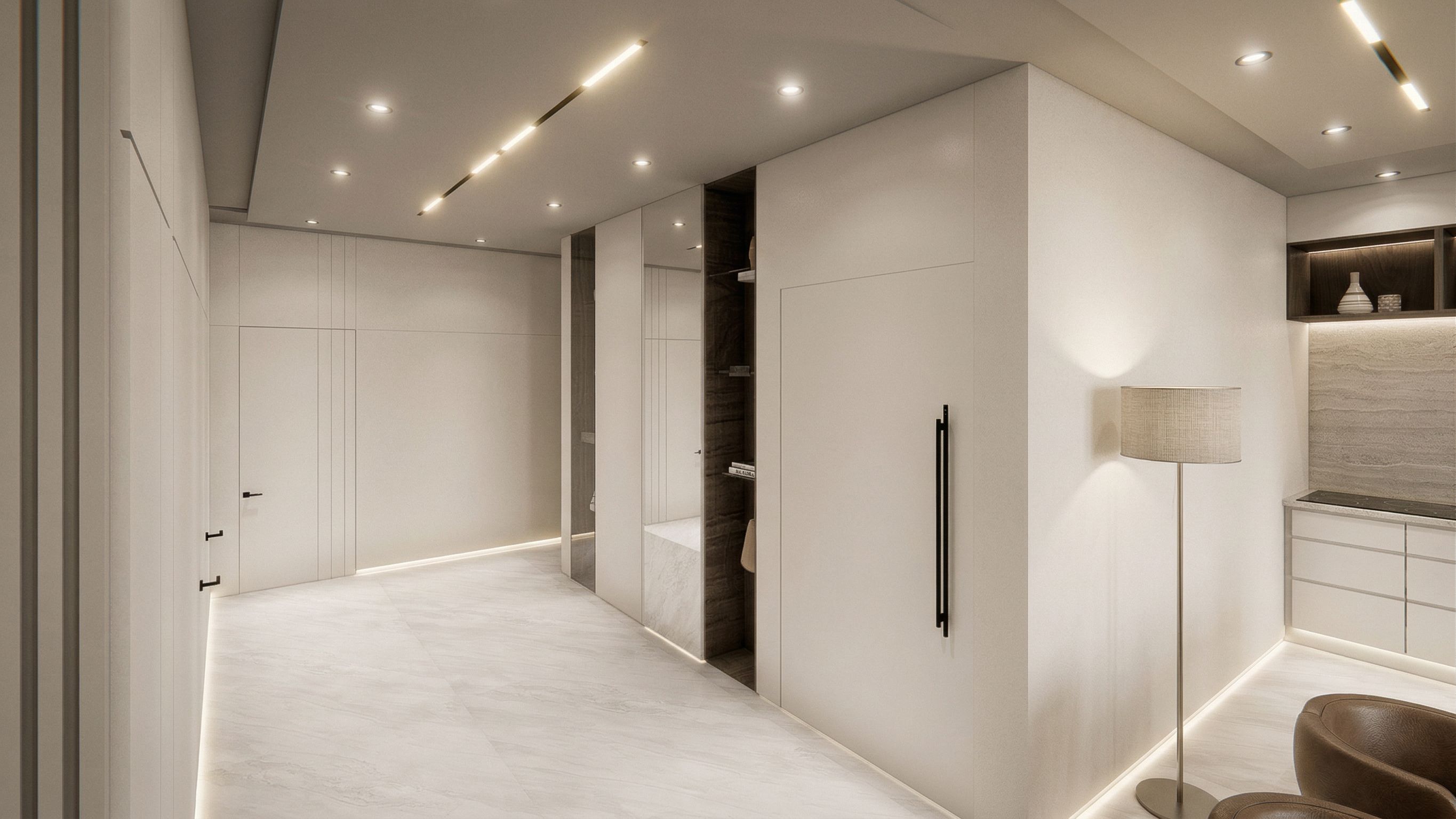Photo of a modern interior space featuring sleek, minimalist design elements. Highlight the clean lines, textured surfaces, and a harmonious palette of white and beige. The kitchen is equipped with elegant cabinetry and modern appliances, juxtaposed with stone accents. Set in a well-lit environment, showcase soft shadows from recessed lighting illuminating the space. Perspective from a corner view, using a wide-angle lens to capture the depth and flow of the layout, enhancing the spacious feel and inviting ambiance of this architectural design., keep exact camera angle