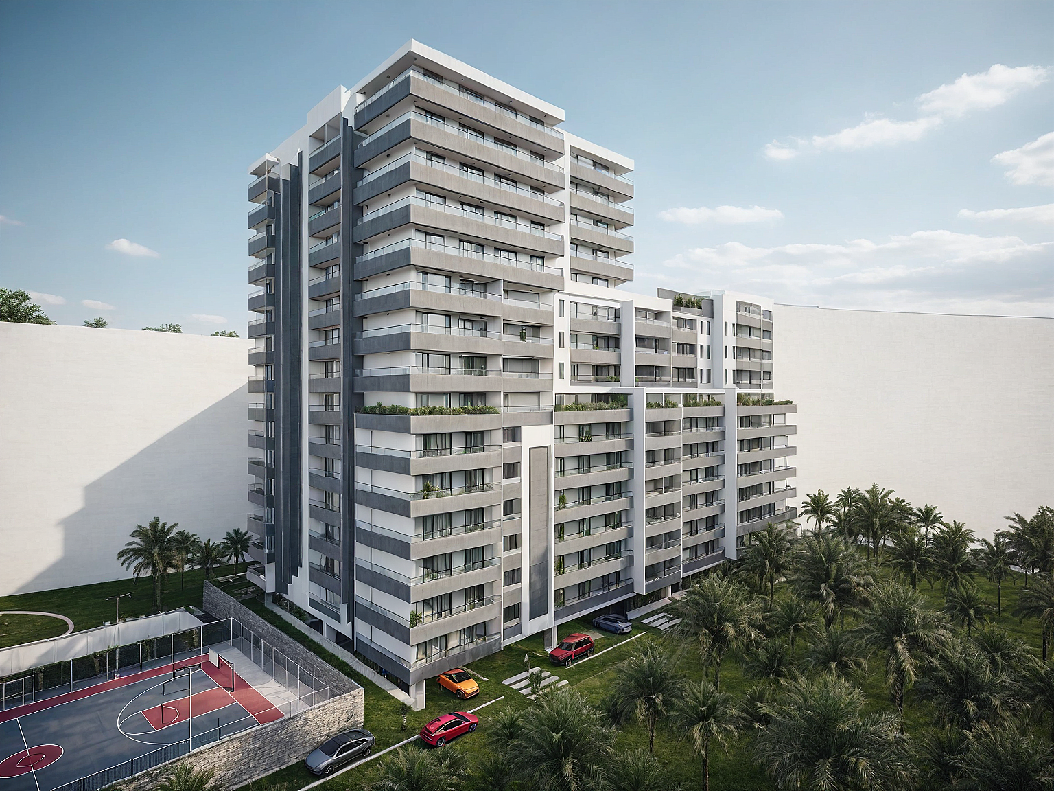 Promptcolored basketball court, grey hotel, everything else colored, trees with grass