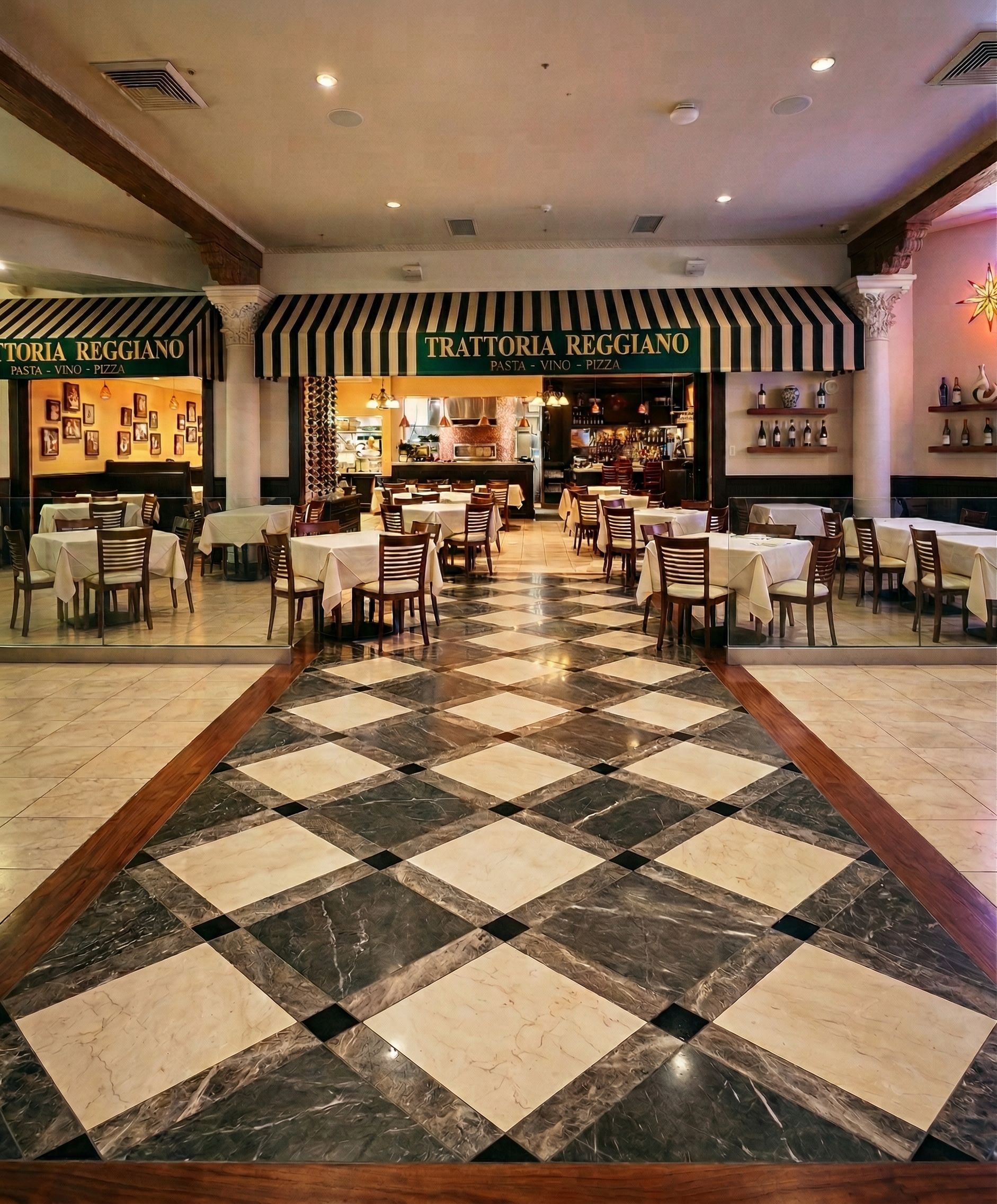 Promptstop flooring at glass. use this pattern for entrie patio. remove table and chairs in front of glass. Stripe patio awnings black and beige. Do not alter anything else., keep exact camera angle