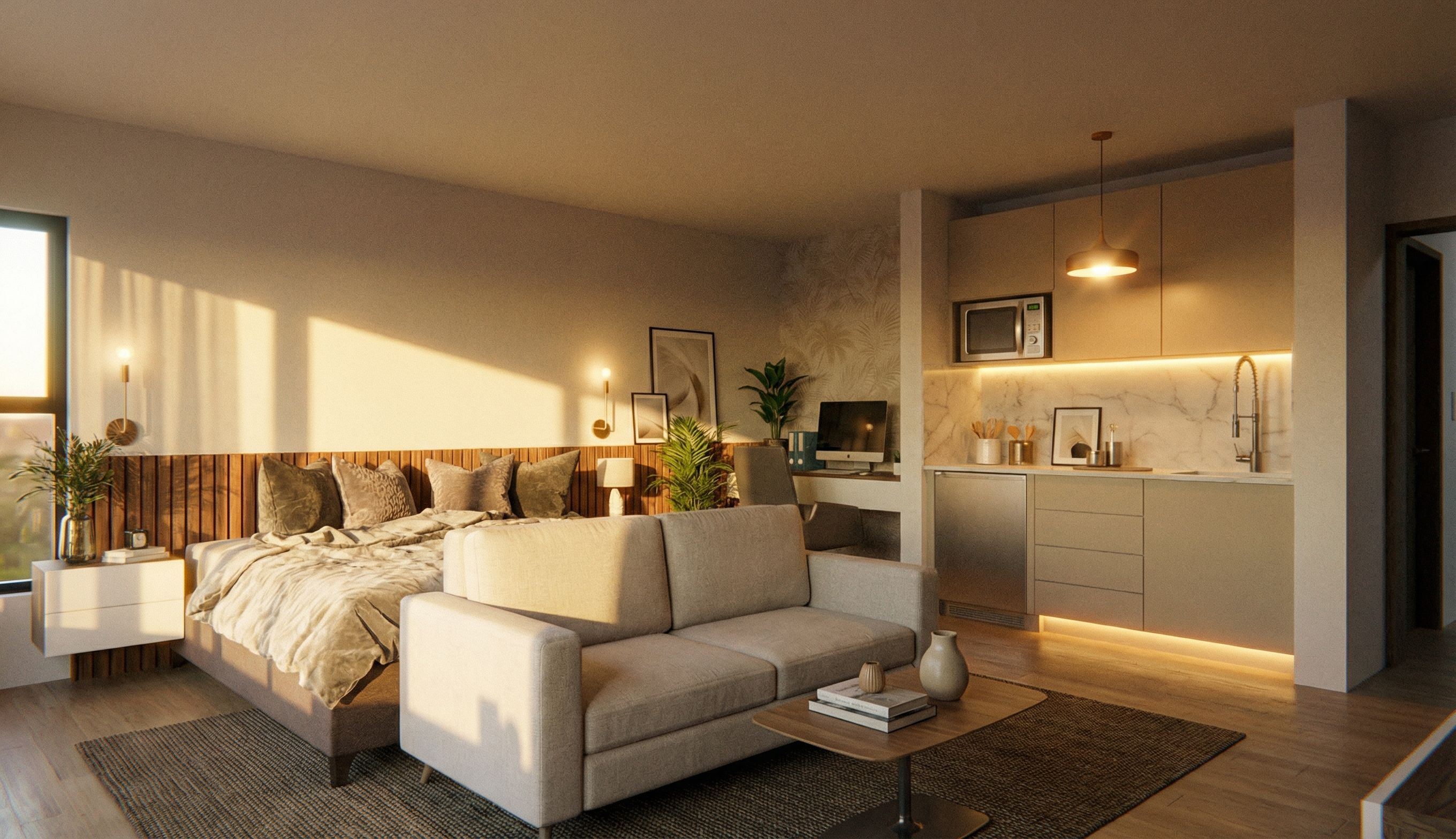 PromptAn interior view of a master suite features a sleeping area with a bed, a slatted wooden headboard, and decorative pillows. At its foot is a light-colored sofa, a small coffee table, and a woven rug. A compact kitchenette occupies one wall, equipped with beige cabinets, a microwave, and a marble-patterned backsplash and countertop with a sink and faucet. The walls are light-toned, with one accent wall featuring a subtle patterned wallpaper and a desk with a computer on it, and wooden floorboards extend throughout the space. A large window allows ample natural light to fill the room during the day., keep exact camera angle