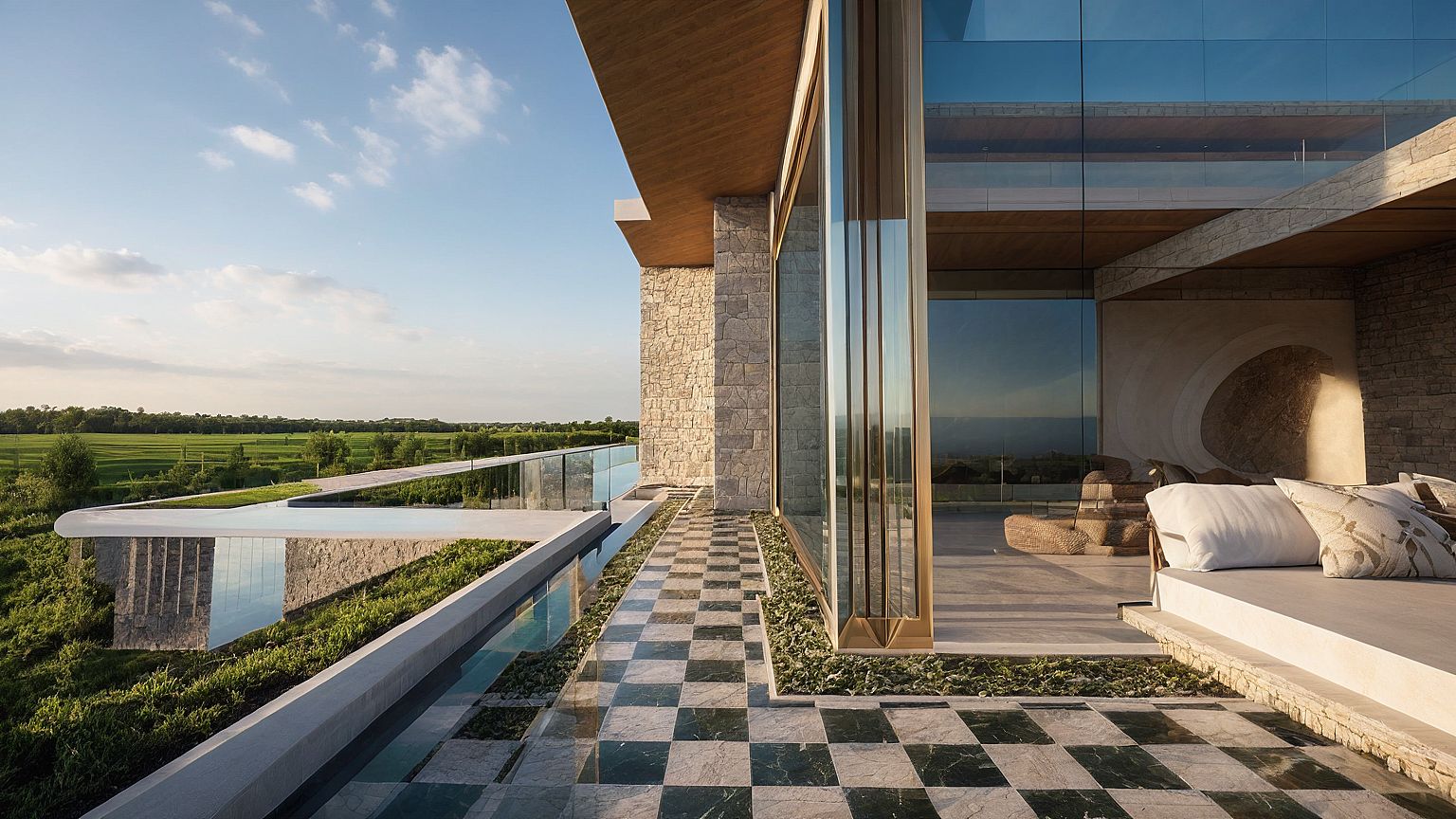 PromptPhoto of a modern villa, characterized by large glass panels and stone accents, featuring an elegant terrace with a pool. Emphasize the smooth textures of the glass and natural stones, along with the unique checkerboard pattern of the flooring. Set in a serene countryside backdrop with lush green fields. Highlight golden hour lighting, casting warm reflections on the glass surfaces, creating gentle shadows. Capture a wide-angle view from a low perspective to showcase the villa's openness and connection to the landscape, utilizing a 24mm lens for a dynamic composition.