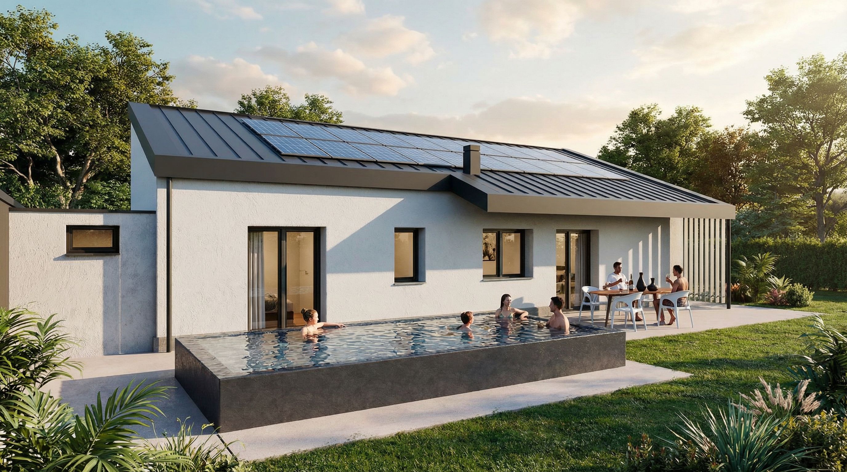 architectural exterior rendering, render this 3D mass into photorealistic rendering, add people in pool, people seating, keep exact camera angle, high quality, professional, detailed scene